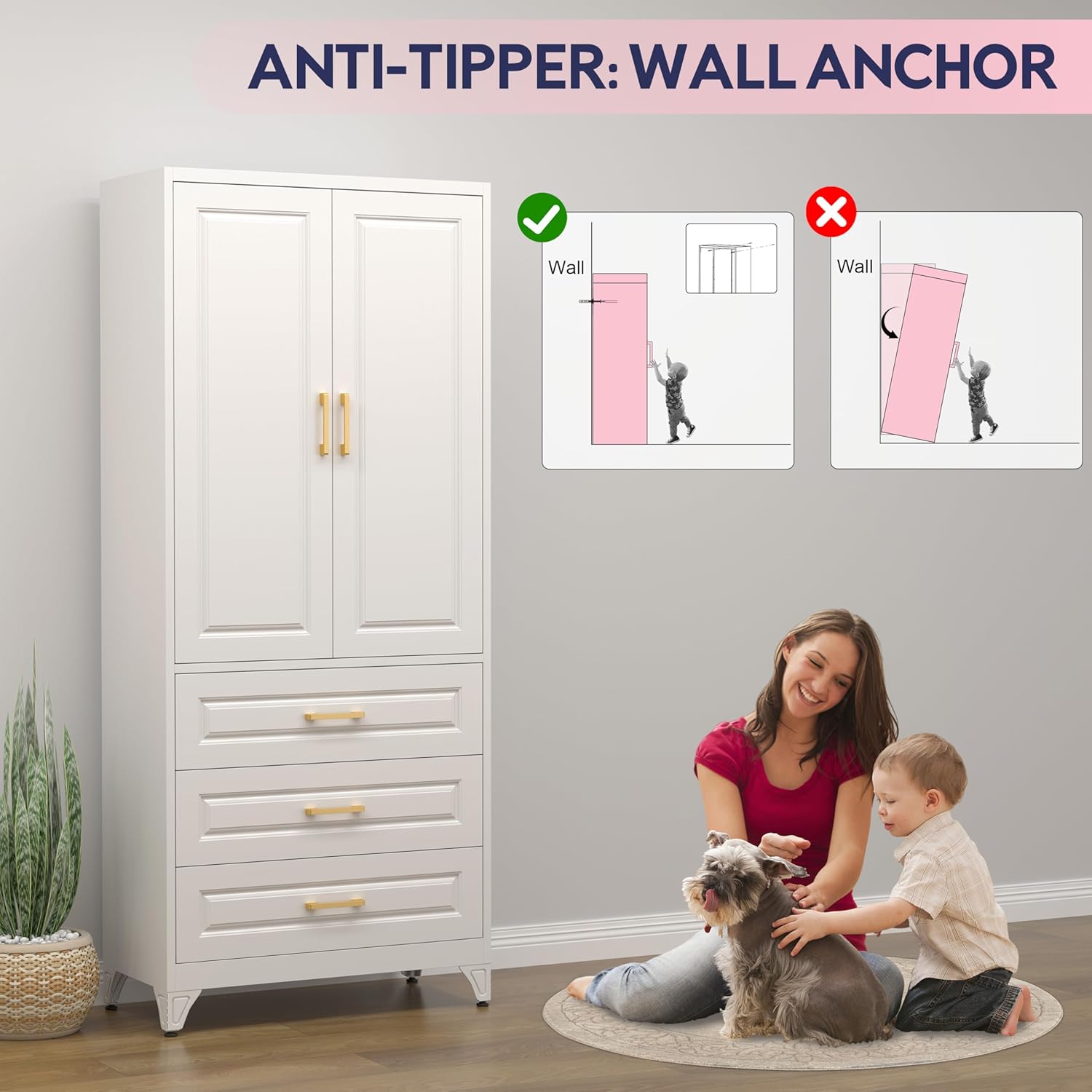 • Secure Anti-Tip Design: Built-in wall mounting holes secure the tall cabinet to prevent tipping and ensure safety around children or pets. Adjustable legs compensate for uneven floors and prevent wobbling. Reliable pantry storage cabinet for kitchens, garages, or home offices