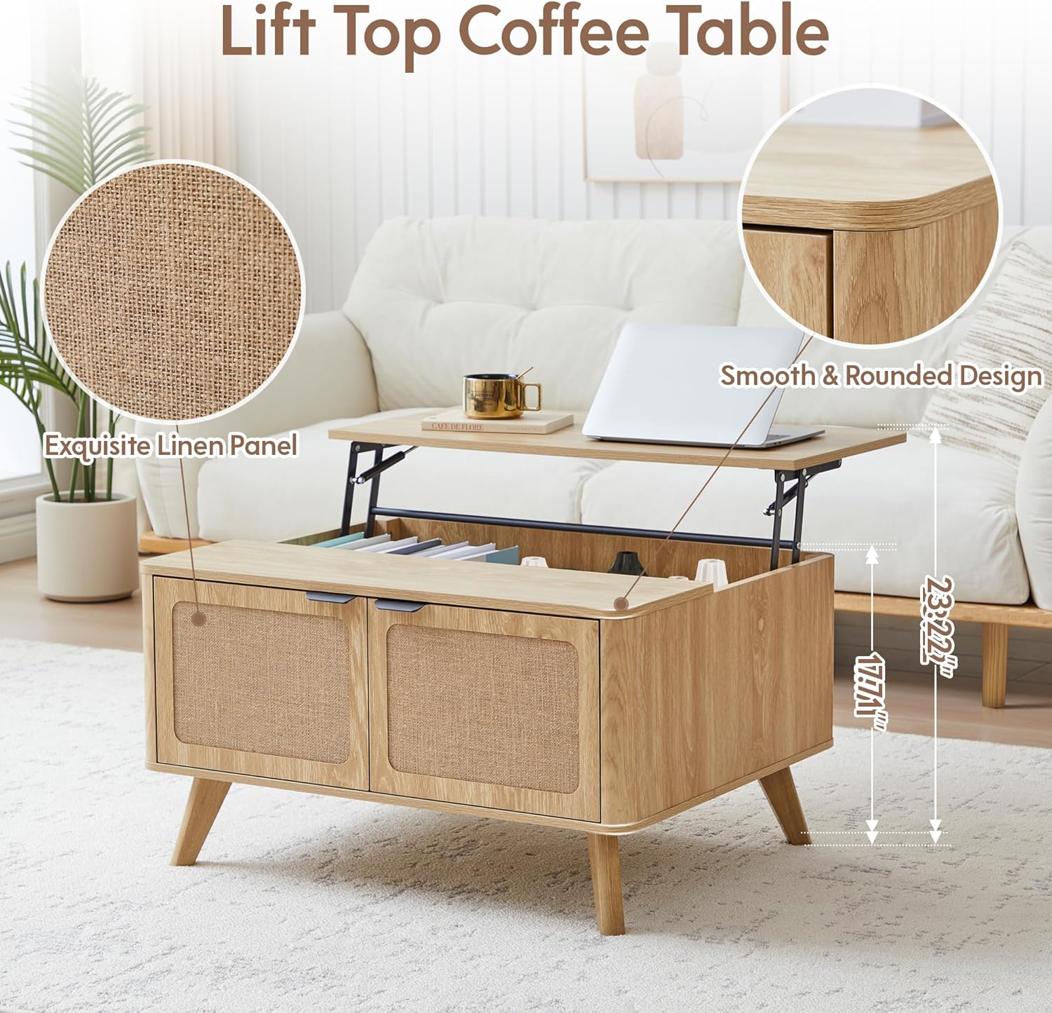 • Ample Hidden Storage Space: The 31.5 x 25.6x (17.7-23.2) inch rectangle coffee table has a spacious hidden compartment and two front-access linen door cabinets. Perfect for stashing books, remotes, laptops, or cozy blankets. Keep your living room clutter-free while maintaining a sleek aesthetic.