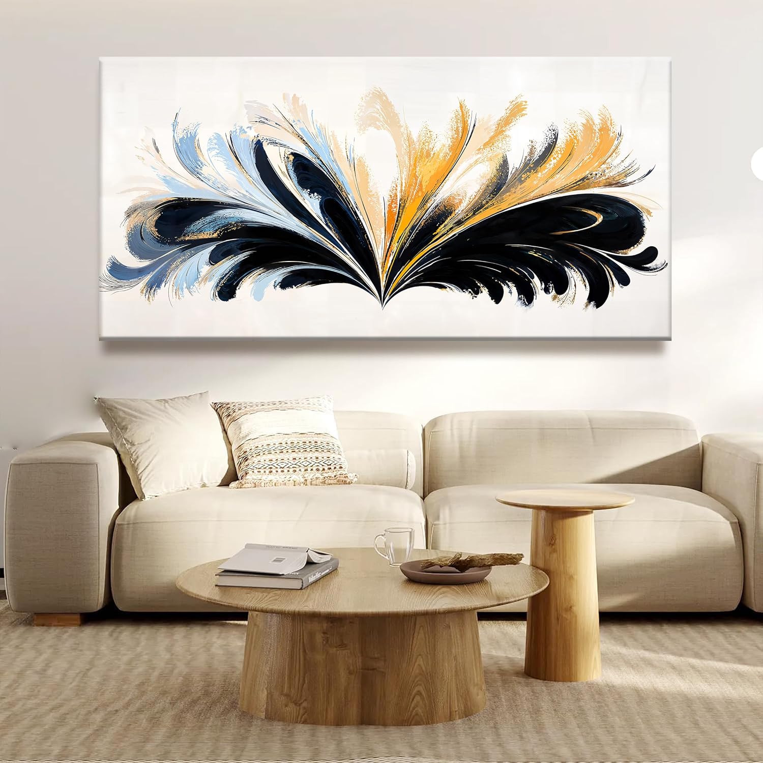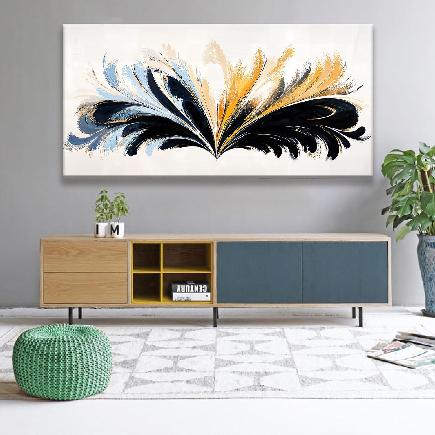 QSQ Large Black And Gold Abstract Wall Art For Living Room Canvas Art Wall Decor Abstract Blue Feather Wall Decor Print Picture For Bedroom Apartment Office Home Wall Decoration 29 X 58 Inch