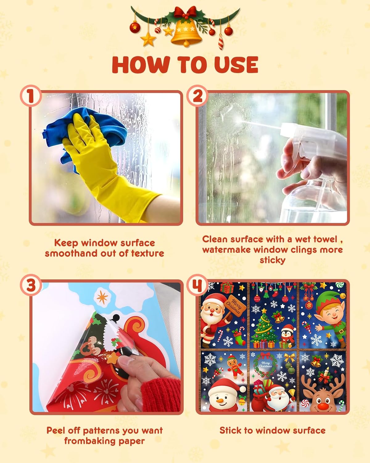 • Easy to Use: No adhesives or glue required! Simply clean the surface, spray a little water, peel off the decal, and stick it on smooth surfaces like windows, mirrors, or glass doors. The decals adhere firmly and can be easily removed without leaving any residue. Plus, they're reusable, so you can enjoy them year after year