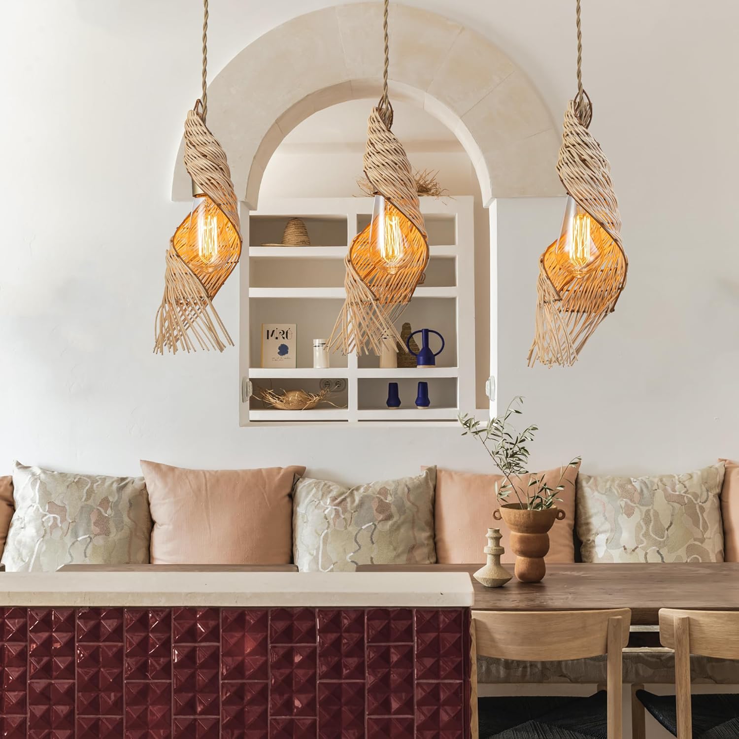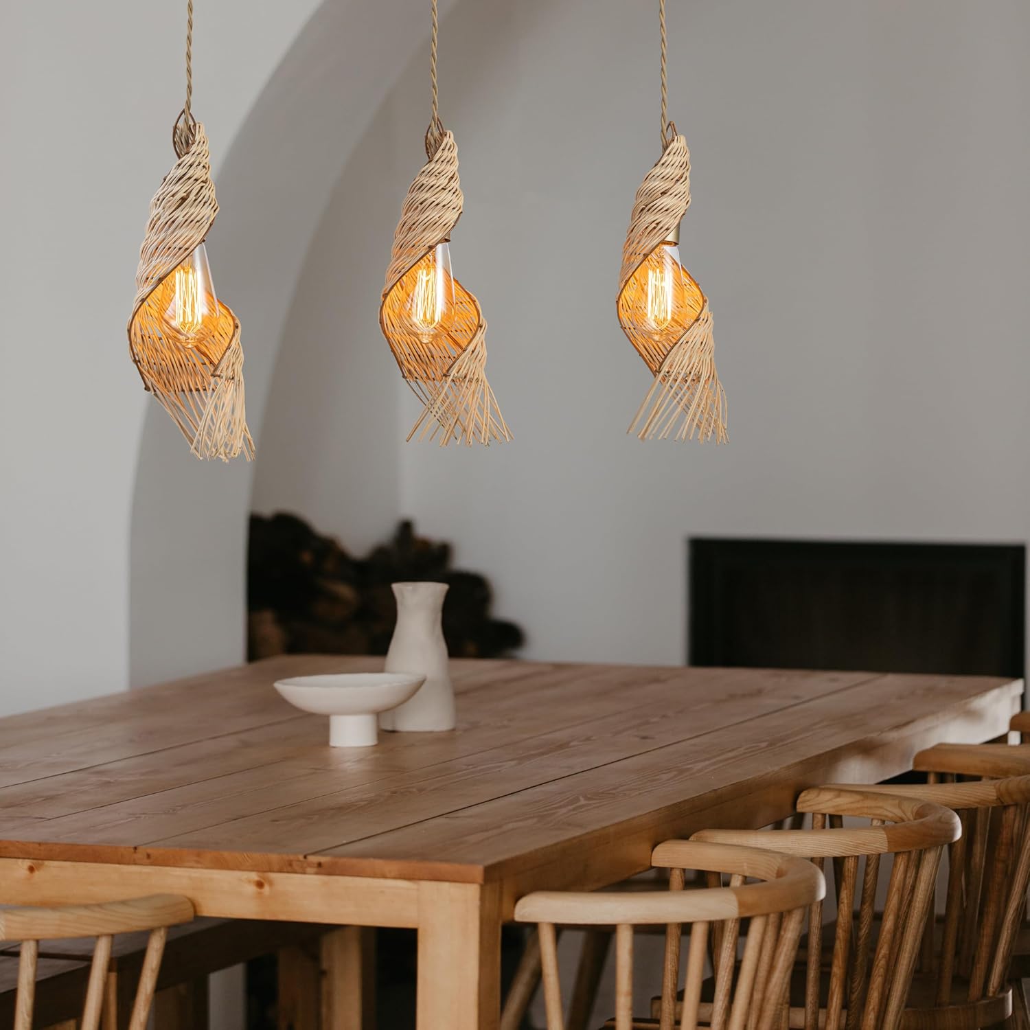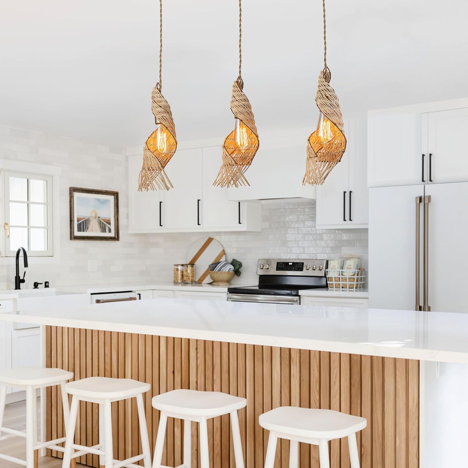• Boho-Chic Kitchen Lighting – This 3-light spiral rattan pendant is perfect for kitchen islands, featuring a unique cluster of woven rattan shades that bring texture and coastal charm.