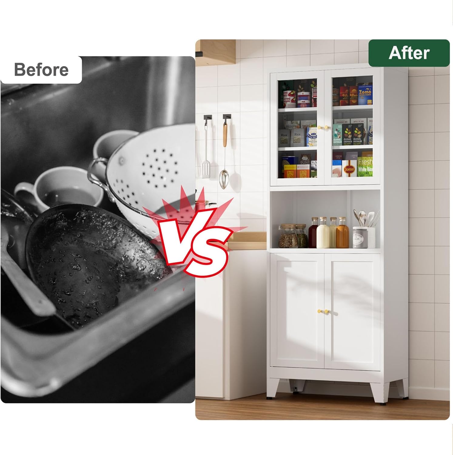 • Multi-functional Applications: The metal pantry cabinet with 4 magnetic doors and adjustable shelves, you can adjust the height of the shelves to suit the storage needs of different sized items. This cabinet is suitable for kitchen, dining room, living room, bathroom and also can be used as a bookcase