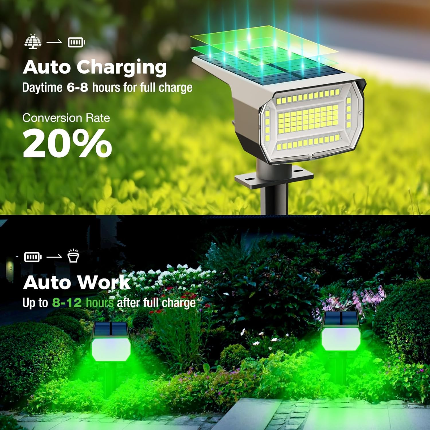 • Solar Powered & Energy Saving: The solar spotlight use solar energy to charge, which can automatically sense light, automatically turn on at night, and automatically charge during the day, saving electricity and reducing energy consumption