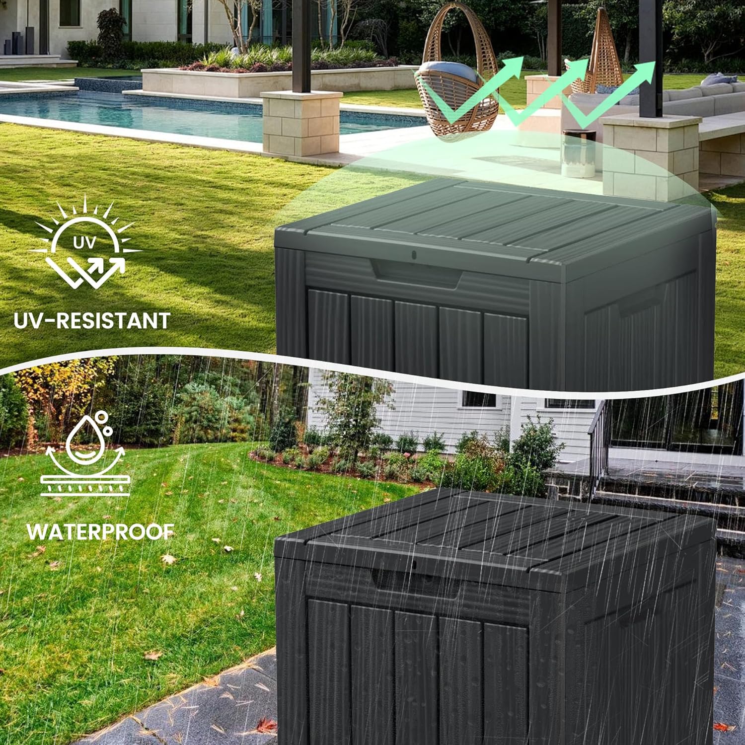 • Aesthetic and Practical: The charming wood grain effect adds a natural aesthetic appeal. UV-resistant and weather-proof, it ensures that items inside remain dry and ventilated, suitable for all outdoor conditions