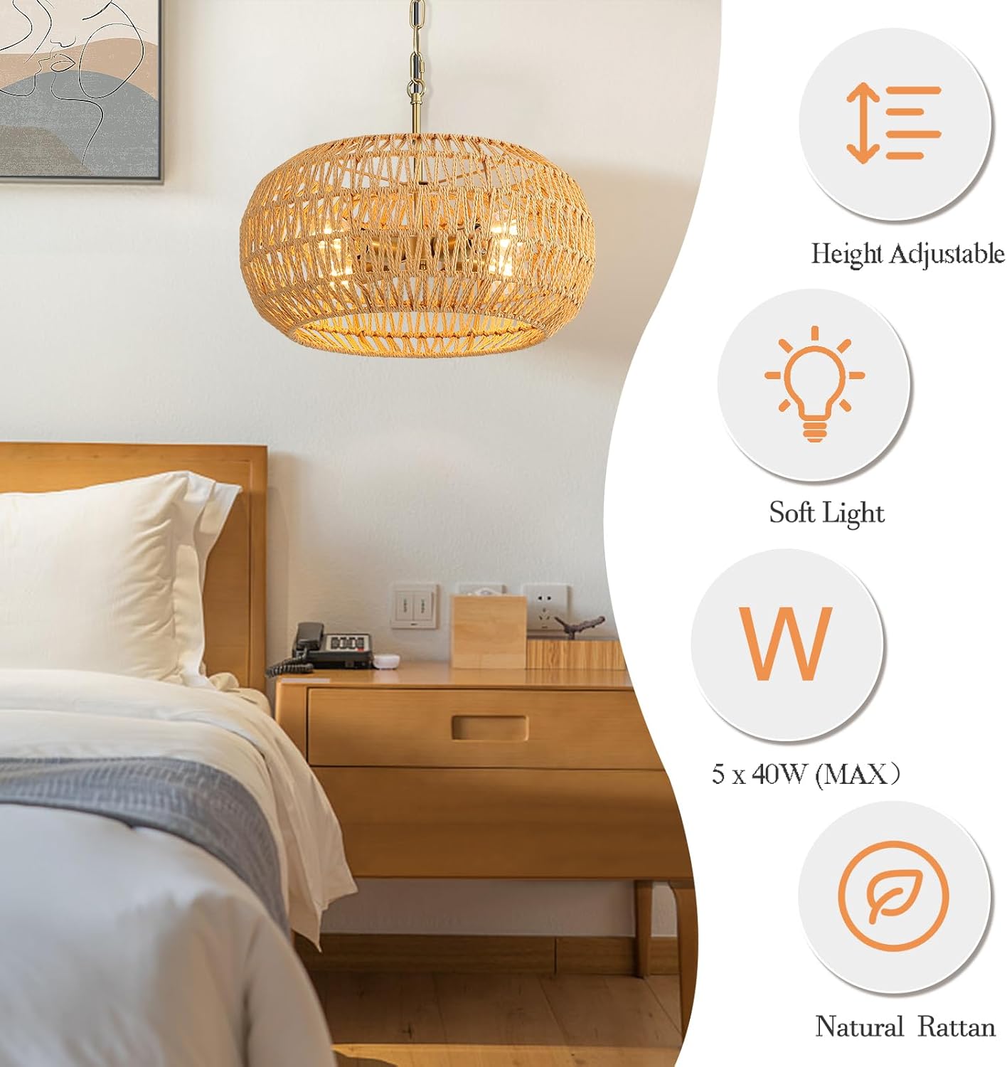 • 【4-Light 360° Illumination】Equipped with four E26 sockets (bulbs not included),this woven pendant light emits ambient 360° glow.Compatible with dimmable LED/incandescent bulbs (max 40W),it creates a warm bohemian atmosphere in living rooms,hallways,or nurseries.