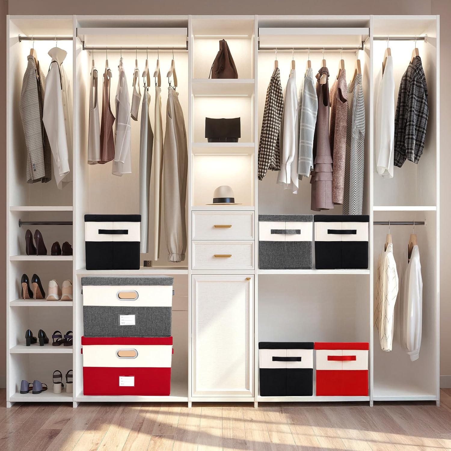Large Linen Fabric Foldable Storage Bins with Removable Lid and Handles, Washable Storage Box Organizer Containers Baskets Cube with Cover for Bedroom,Office(Red&Cream, Large)