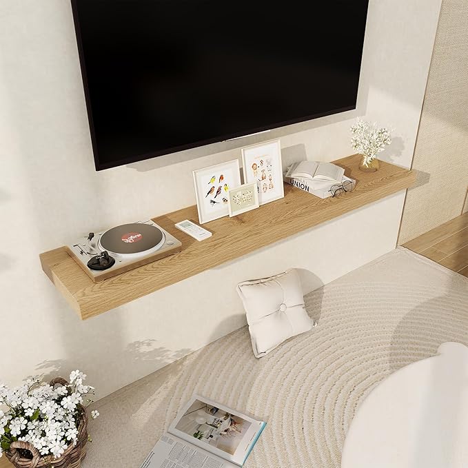 • 【12 INCH DEEP FLOATING SHELF】This extra deeper and thicker wall shelves are 12 inches in depth and 2 inches in thickness instead of the regular narrow floating shelves, you can put photos, pictures, DVD players, videos, books, toys, and some other knickknack on this beautiful display wooden shelf.