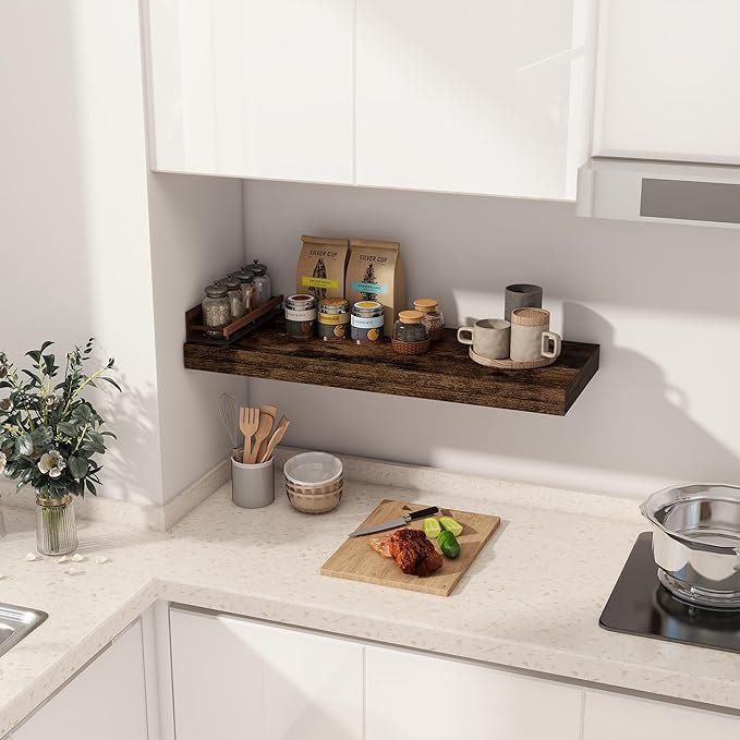 • 【FARMHOUSE RUSTIC WALL SHELF】These floating shelves are made of premium engineered wood board and invisible one-piece bracket. The rustic wooden grain surface add character and warmth to any modern or traditional interior with these thick floating shelves, contrast shelves at staggering heights on the wall or mount side-by-side or in the corner for a clean streamlined look.