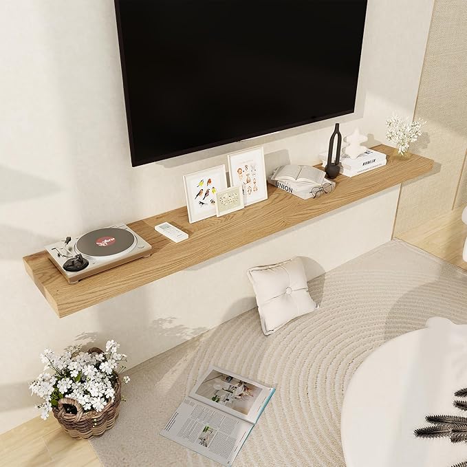 • 【12 INCH DEEP FLOATING SHELF】This extra deeper and thicker wall shelves are 12 inches in depth and 2 inches in thickness instead of the regular narrow floating shelves, you can put photos, pictures, DVD players, videos, books, toys, and some other knickknack on this beautiful display wooden shelf.