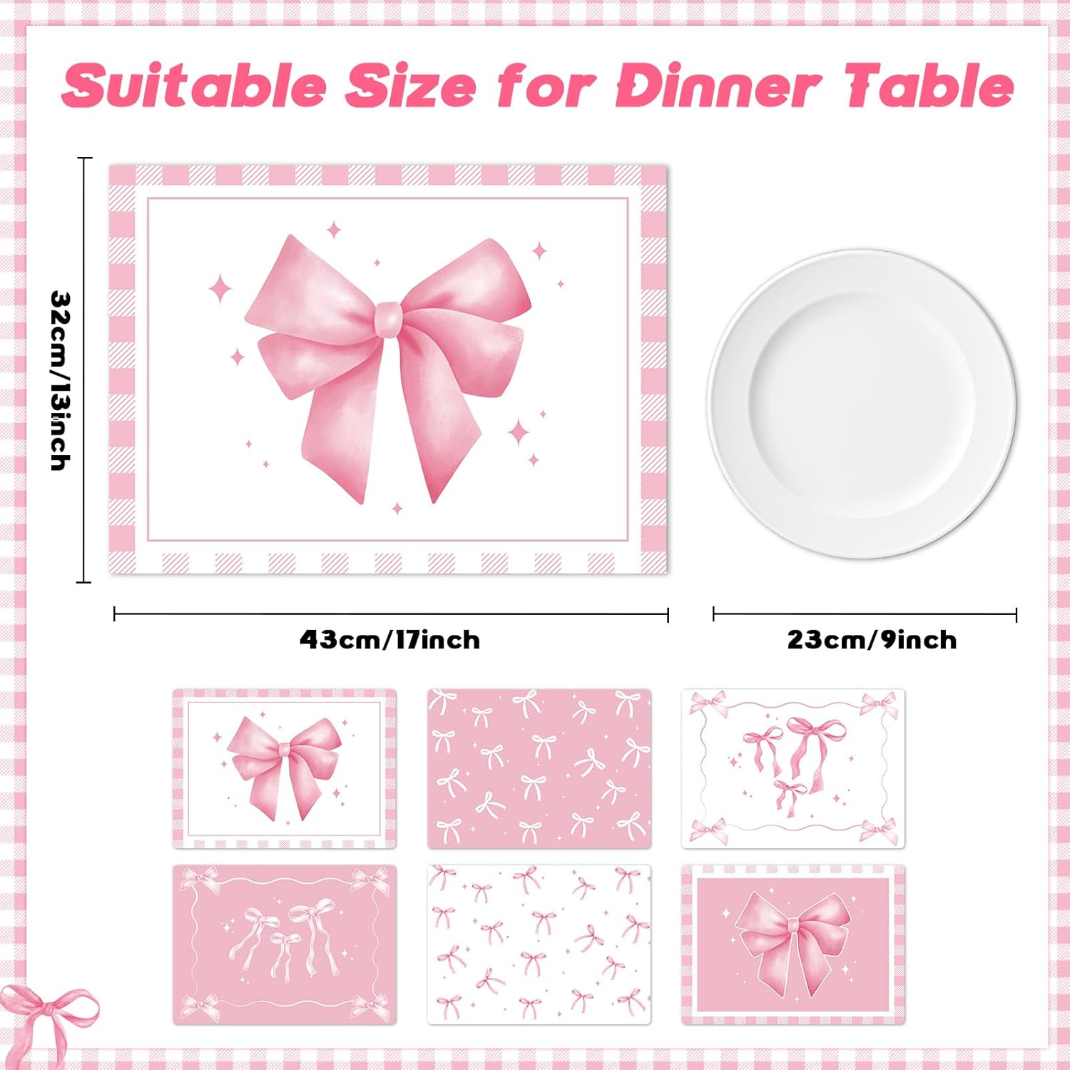• Package Includes: Our table decoration set includes 6 pieces of pink bow place mats. Each pink ribbon bow table mat measures 19.92 x 12.59 inches, providing ample coverage to protect your tabletop from food and drink spills, ensuring your dining surface stays clean and tidy