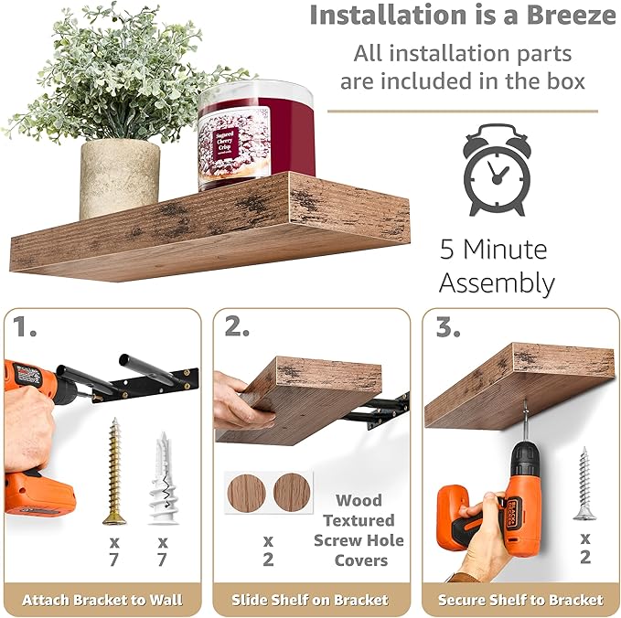 • Easy Installation: Mounting hardware INCLUDED the Hanging shelves are made of beautiful MDF with PVC + Bracket - Sturdy enough to arrange and display your favorite small objects - Attaches firmly to the wall without visible support - Minor assembly required - Supports up to 22 pounds per shelf - Measures approximately 16.25 inch L x 5.50 inch W - Each display shelf 1.5 inch thick