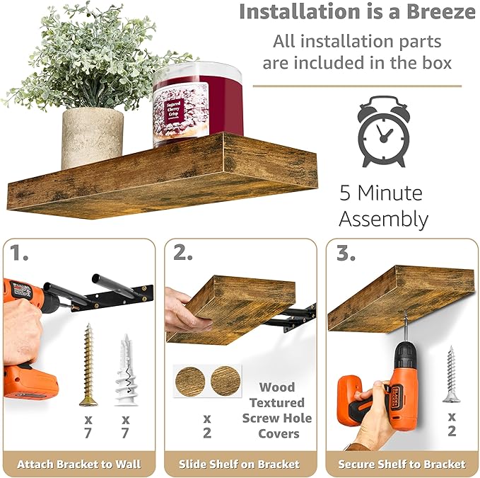 • Easy Installation: Mounting hardware INCLUDED the Hanging shelves are made of beautiful MDF with PVC + Bracket - Sturdy enough to arrange and display your favorite small objects - Attaches firmly to the wall without visible support - Minor assembly required - Supports up to 22 pounds per shelf - Measures approximately 16.25 inch L x 5.50 inch W - Each display shelf 1.5 inch thick