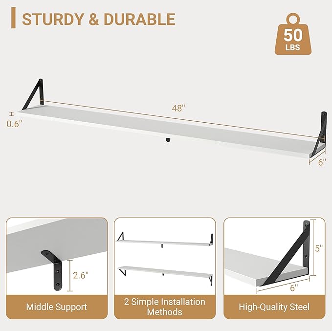 • 【STURDY & DURABLE】Each wood floating shelves is made of 0.6-inch thick natural wood planks and powder coated steel brackets for durability. The triangular metal brackets are even stronger and can hold up to 40 pounds