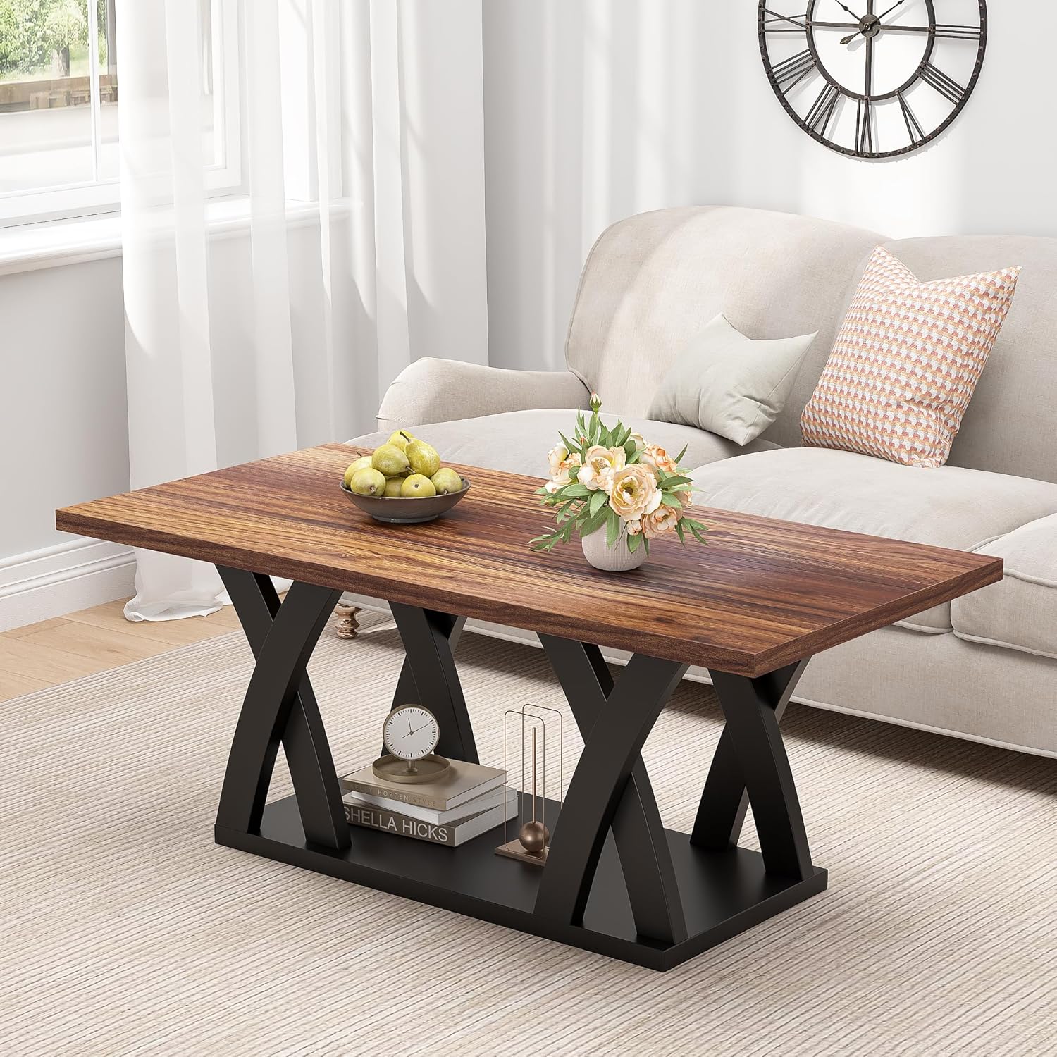 • 【Stylish and Functional Coffee Table】 This coffee table features a rectangular design with a modern touch, making it perfect for wood coffee tables for living room or as a mesa de centro para sala. Its coordinated colors and sleek X-shaped base blend effortlessly into various styles, whether as a Farmhouse Coffee Table with Shelf or a centerpiece in a traditional setting. The black blown coffee table design adds a timeless elegance to any space.
