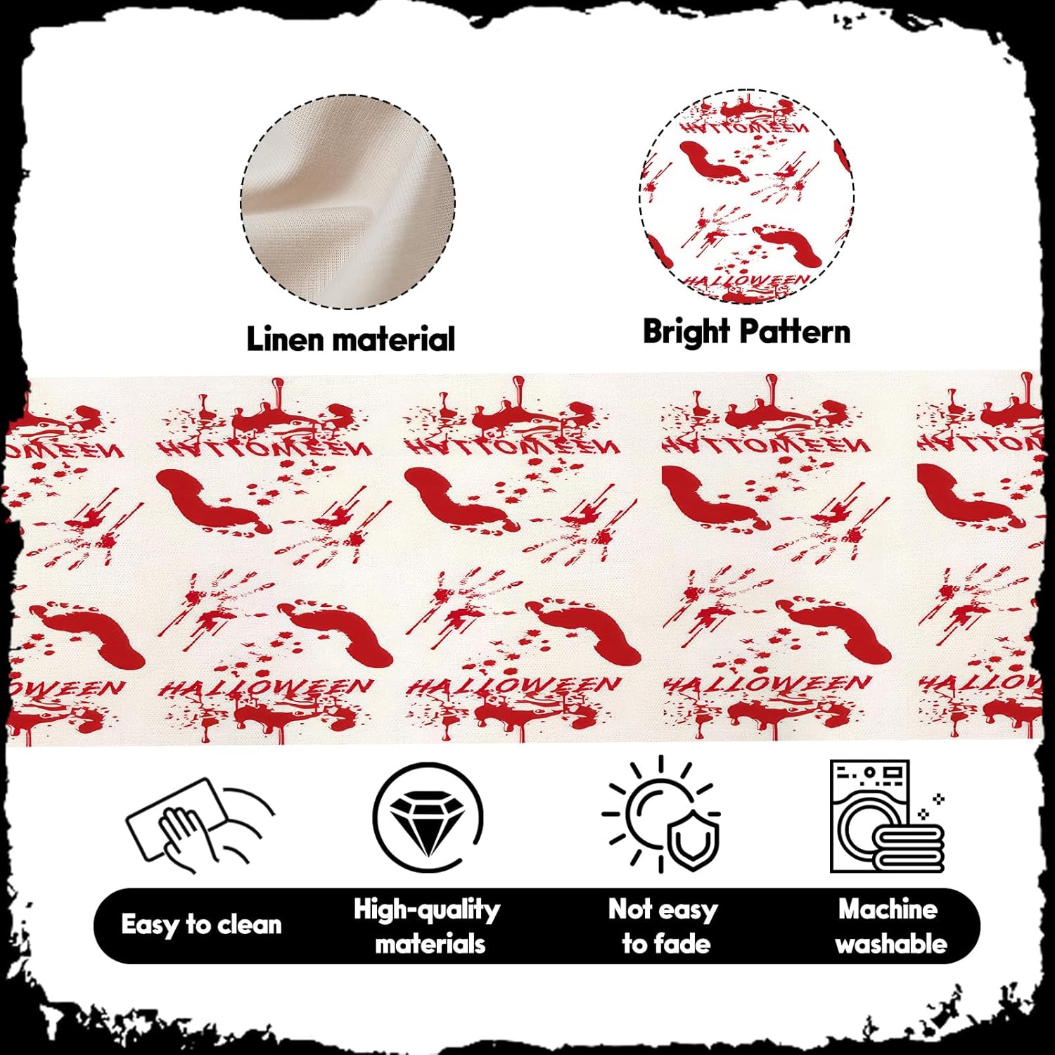 • Package Content: Includes 1 Halloween table runner (13x36 inches) with red bloodstains and footprints printed on it, these classic Halloween elements instantly turn your dining table into the focus of the holiday