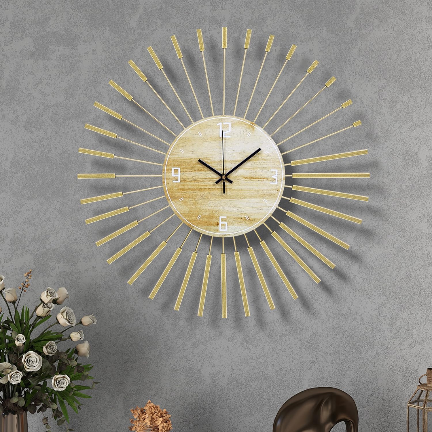 • Iron and Wood Combination Wall Clock – Designed with sturdy iron rays in a radiant sunburst , paired with a warm wood face for a stylish yet natural look.
