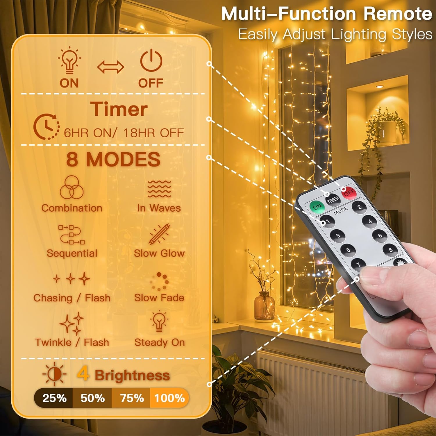 • Versatile Remote Control:Our twinkle lights have 8 lighting modes, 4 brightness levels, and 6H on/18H off timer settings. Simply press the corresponding button on the remote control to easily switch lighting modes and meet different lighting requirements.