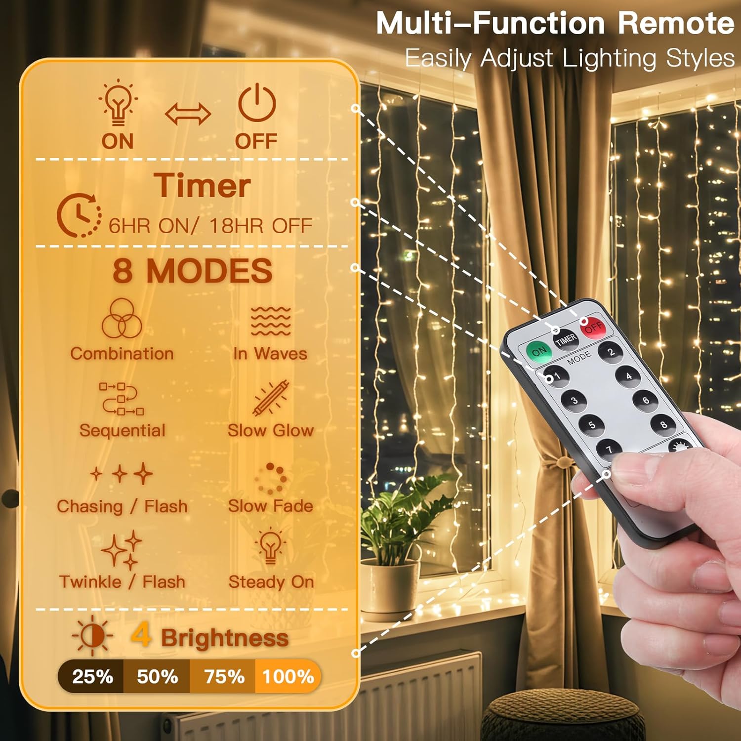 • Versatile Remote Control:Our twinkle lights have 8 lighting modes, 4 brightness levels, and 6H on/18H off timer settings. Simply press the corresponding button on the remote control to easily switch lighting modes and meet different lighting requirements.