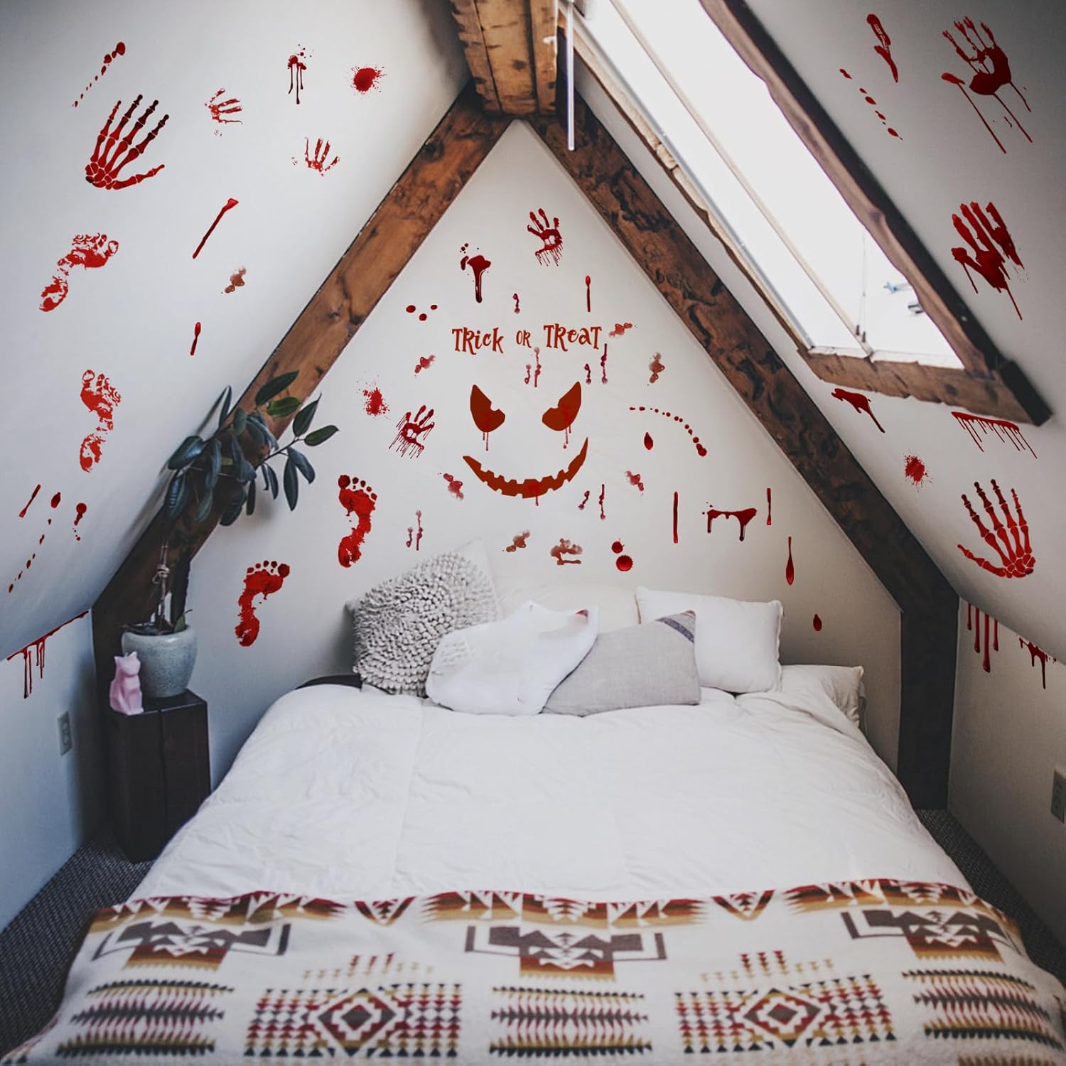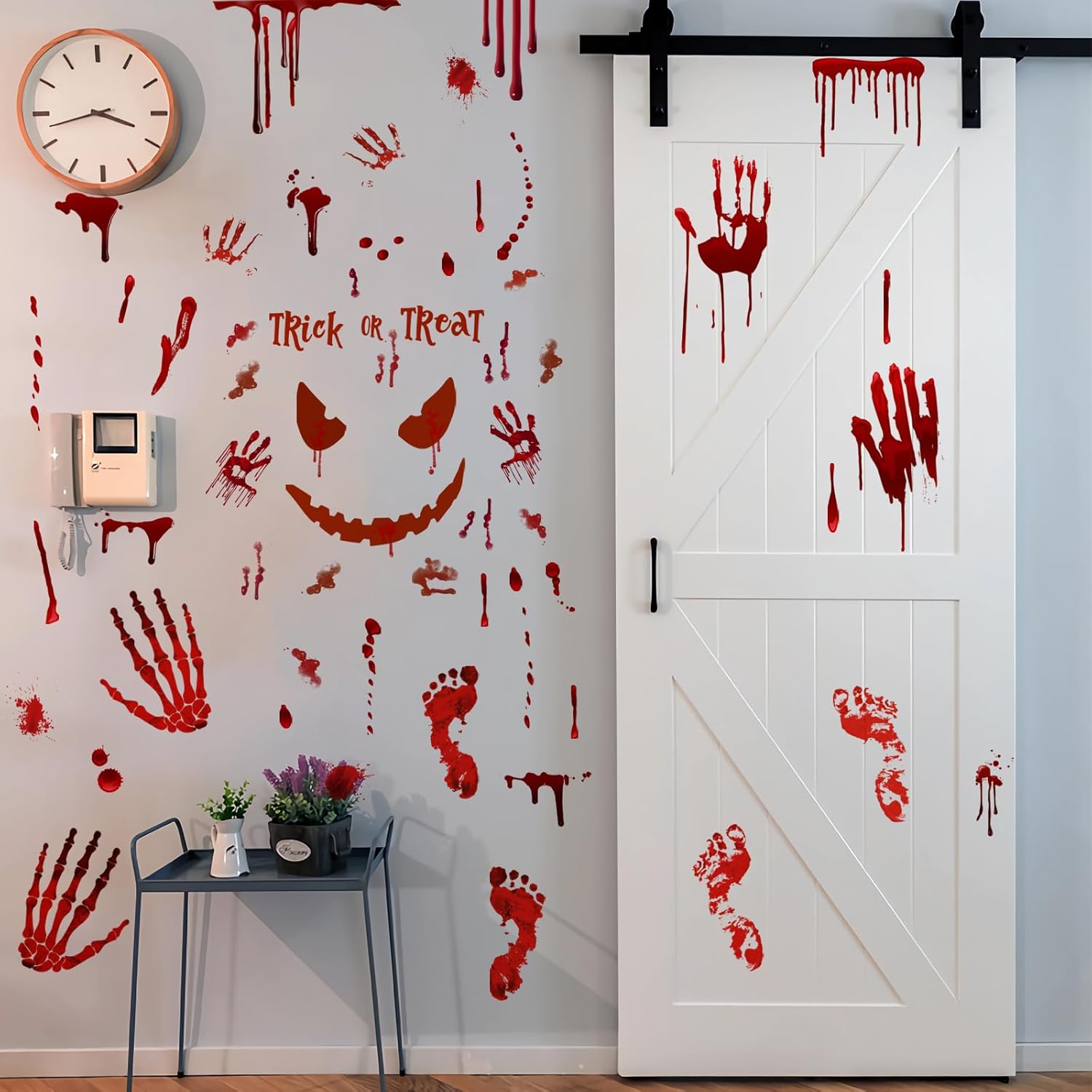 • Scary Halloween Decoration Set: You will get 4 Sheet/62Pcs horror halloween stickers, 11.4 x 11.4 inch and different sizes of the stickers, scary bloody handprint footprints, and bloodstain are perfect for halloween window door bathroom and wall decorations.