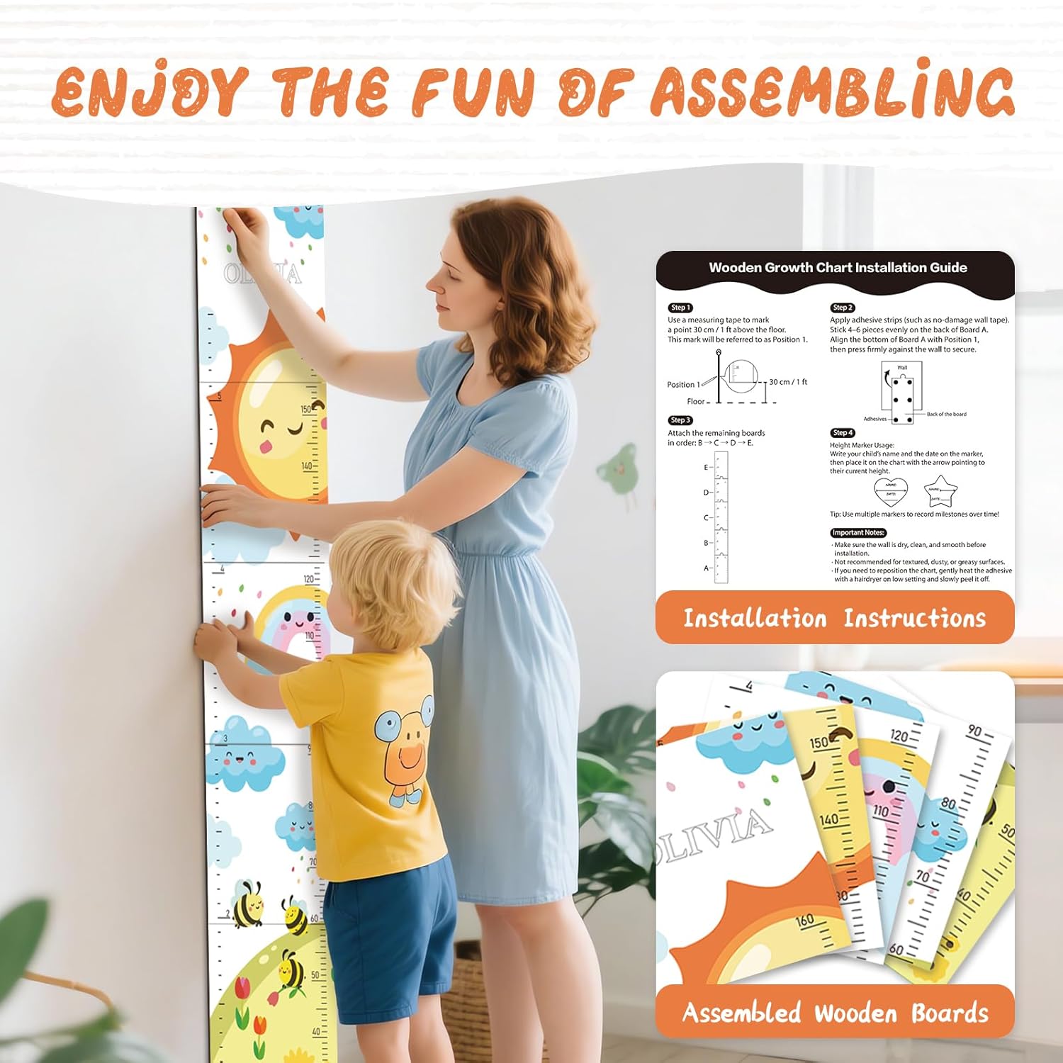 • Easy to Mark: The height measurement is engraved with clear and precise scales, you can customize different shapes of marker cards to record baby's height(with name and date), which is convenient for you to record your baby's growth moments at any time and witness every step of your baby's growth.