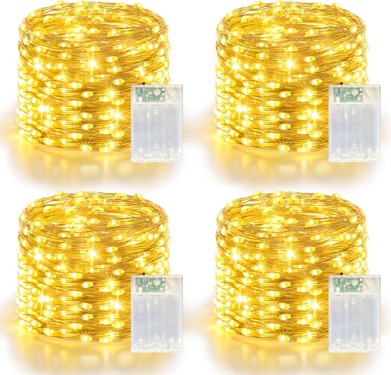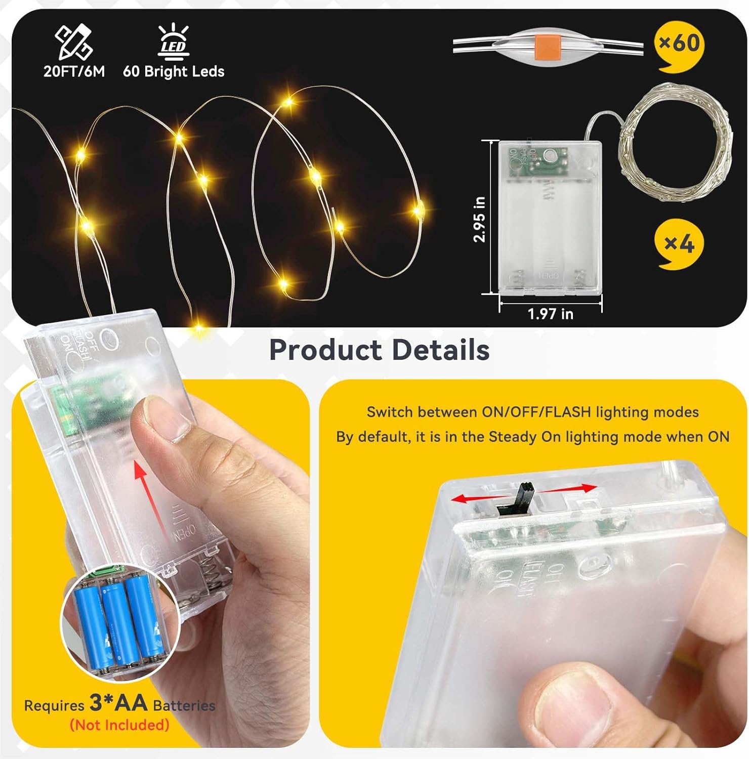• Ultra-Bright Fairy Lights Battery Operated: Each pack includes 4 separate copper wire fairy lights, each featuring 60 brilliant LED bulbs, for a total length of 20FT. Effortlessly illuminate and decorate multiple areas like bedrooms, bookshelves, dining table centers, balconies, patios, and porches—instantly adding a warm, cozy glow to your holiday parties or daily home ambiance.