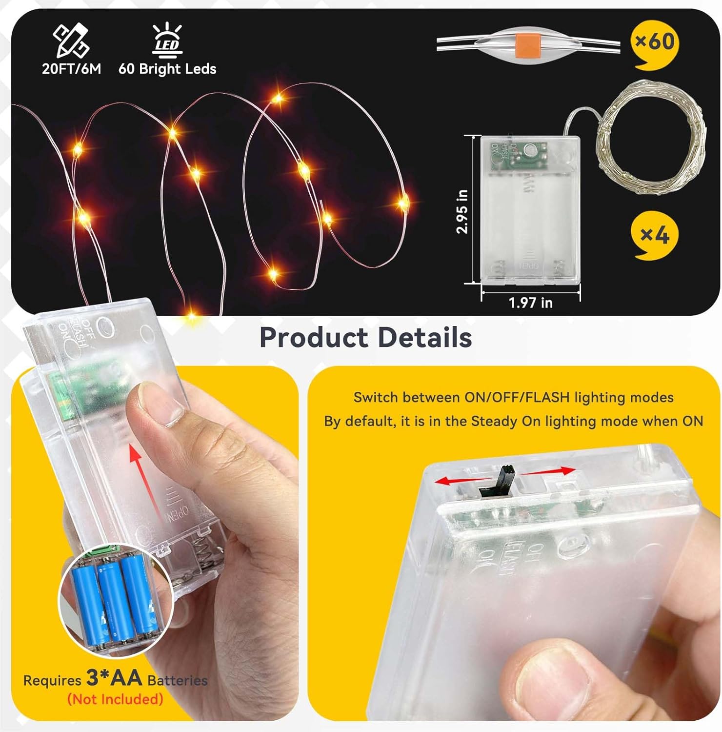 4 Pack 60LED Halloween Fairy Lights Battery Operated - 20FT Twinkle Lights with 2 Lighting Modes Indoor Outdoor, Waterproof Led Fairy String Lights for Christmas, Bedroom, Dorm, DIY Decor, Orange