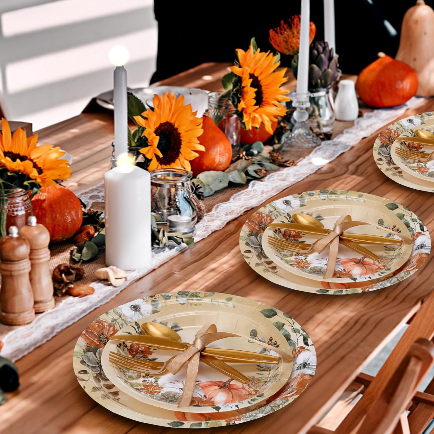 350 Pcs Thanksgiving Fall Party Supplies Dinnerware Set Disposable Plates Napkins Paper Cups Plastic Cutlery for Autumn Thanksgiving Harvest Party Decor Serves 50 (Pumpkin Floral)