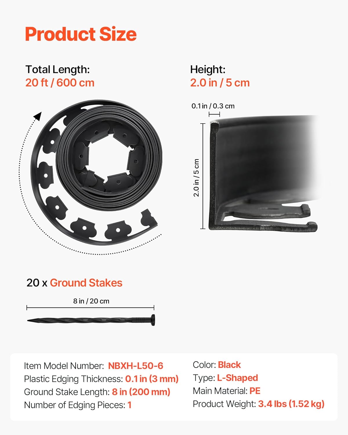 • 20 ft x 2 in Garden Edging: This 20 ft flexible landscape edging strip is ideal for small flower beds or mini green spaces. At 2 in high, it clearly separates garden beds from lawns or gravel paths.