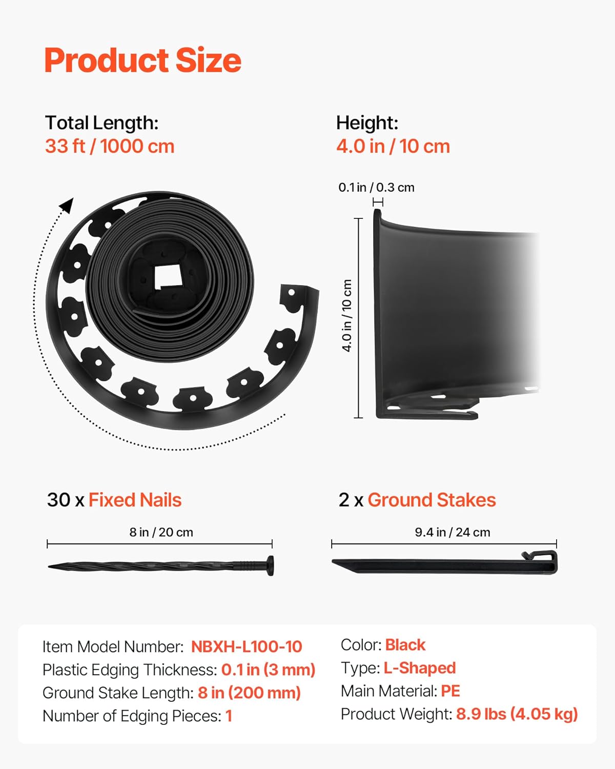• 33 ft x 4 in Garden Edging: This 33 ft flexible landscape edging strip is ideal for medium-sized yards, lawns, and tree ring borders. The 4 in raised height effectively blocks grass root spread and keeps garden boundaries neat.