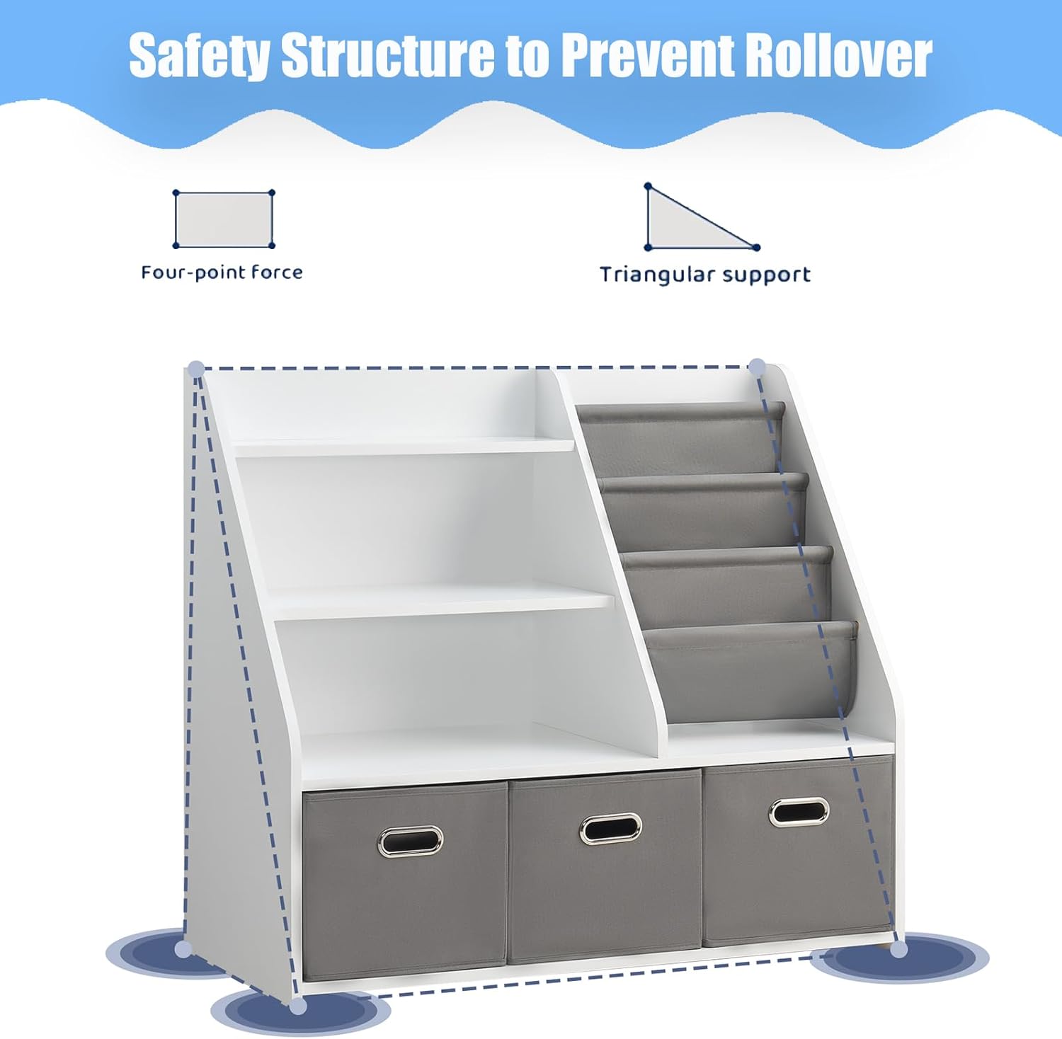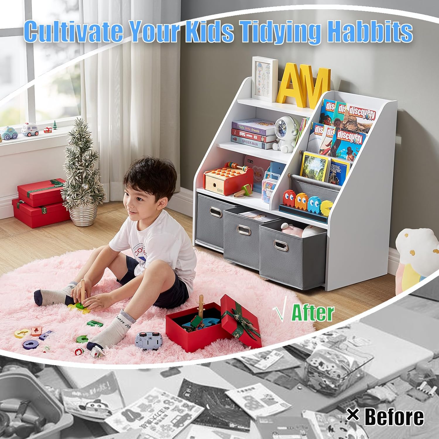 • ⭐️ [ All-in-One Storage Solution for Books & Toys] Features 3-tier fabric sling book rack, 3 open storage shelves, and 3 removable fabric bins — perfect for books, plush animals, blocks, dolls, art supplies, and more. Helps children develop good habits by making cleanup fun and simple.