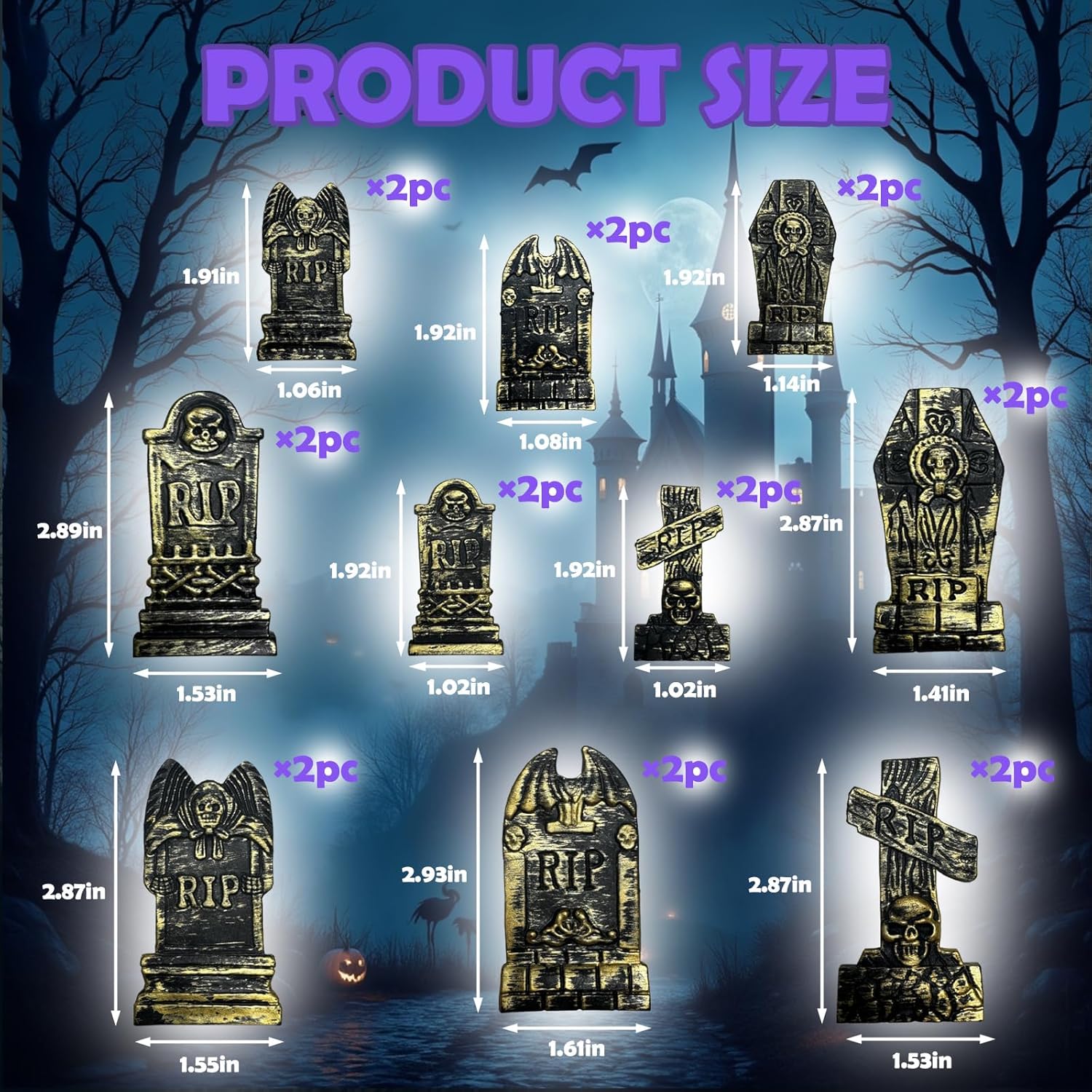 • Halloween Tombstones Set: A total of 20 Mini Halloween Tombstones Figurine. Allow you to decorate your home, event venue, or Halloween landscape with bizarre and scary themes.