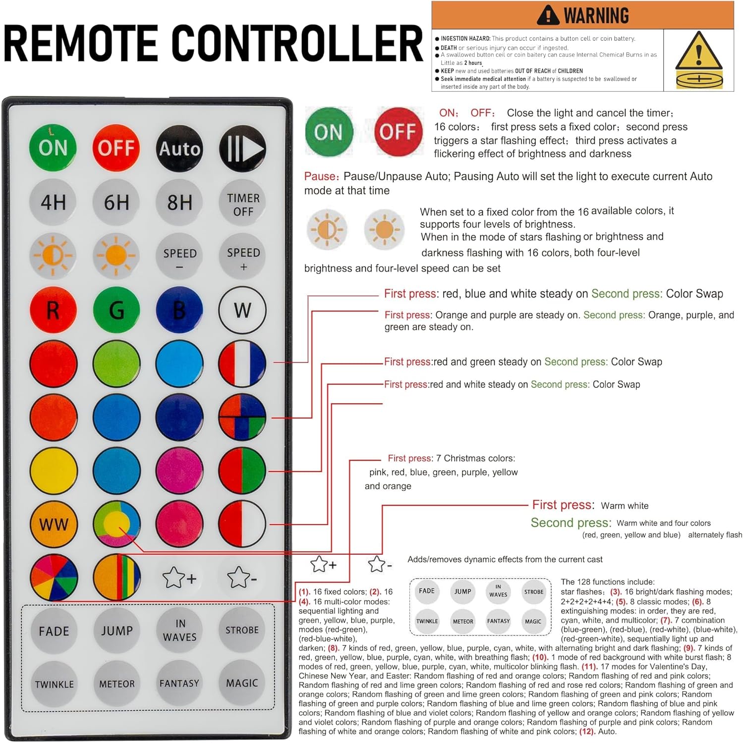 • Dual Control Modes: 1. Bluetooth App: Utilize the Bluetooth app for enhanced features like group control, DIY customization, scene settings, music synchronization, microphone mode, timers, display collections, and looping playback. 2. 44-Key Remote: Easily adjust brightness, speed, set timers, and switch lighting modes with the 44-Key remote. Multiple light strings can be grouped for integrated control, but they cannot be connected end to end