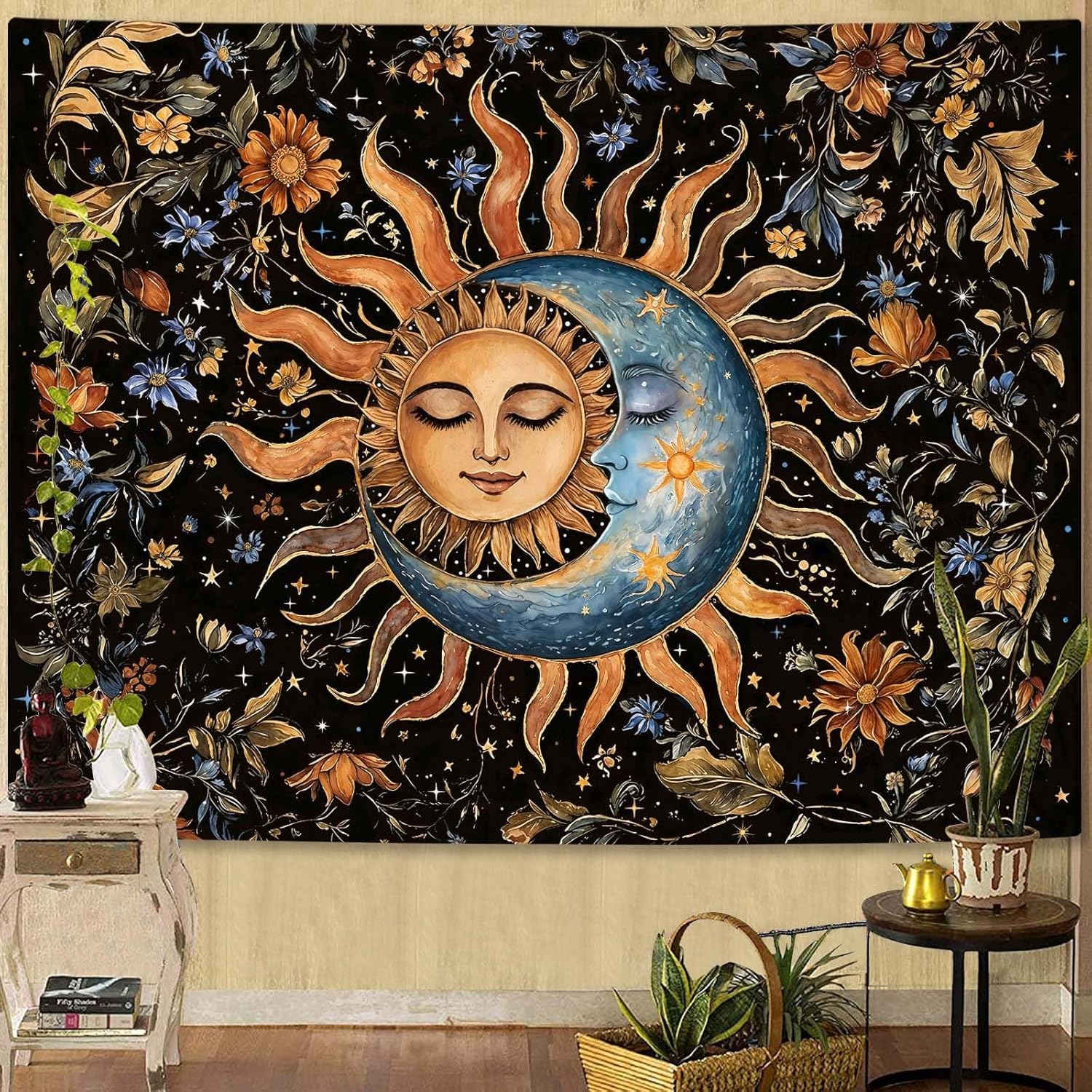 • Unique Sun & Moon Floral Design: Features a captivating scene of a sun and crescent moon with serene faces, surrounded by starry skies and vibrant floral vines, infusing your space with bohemian, celestial charm and a sense of mystical tranquility