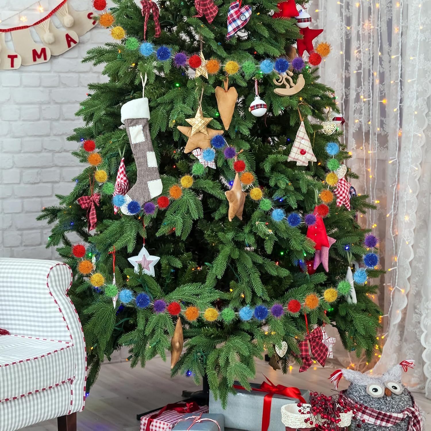 • Package Contents: You will receive 4 packs of 2m long glitter pom pom strings, each Christmas felt ball garland has 30 red, orange, yellow, green, blue, indigo and purple pom poms, and the size of each pom pom is 1 inch. The distance between the felt balls and the total length can be adjusted to meet your party decoration needs
