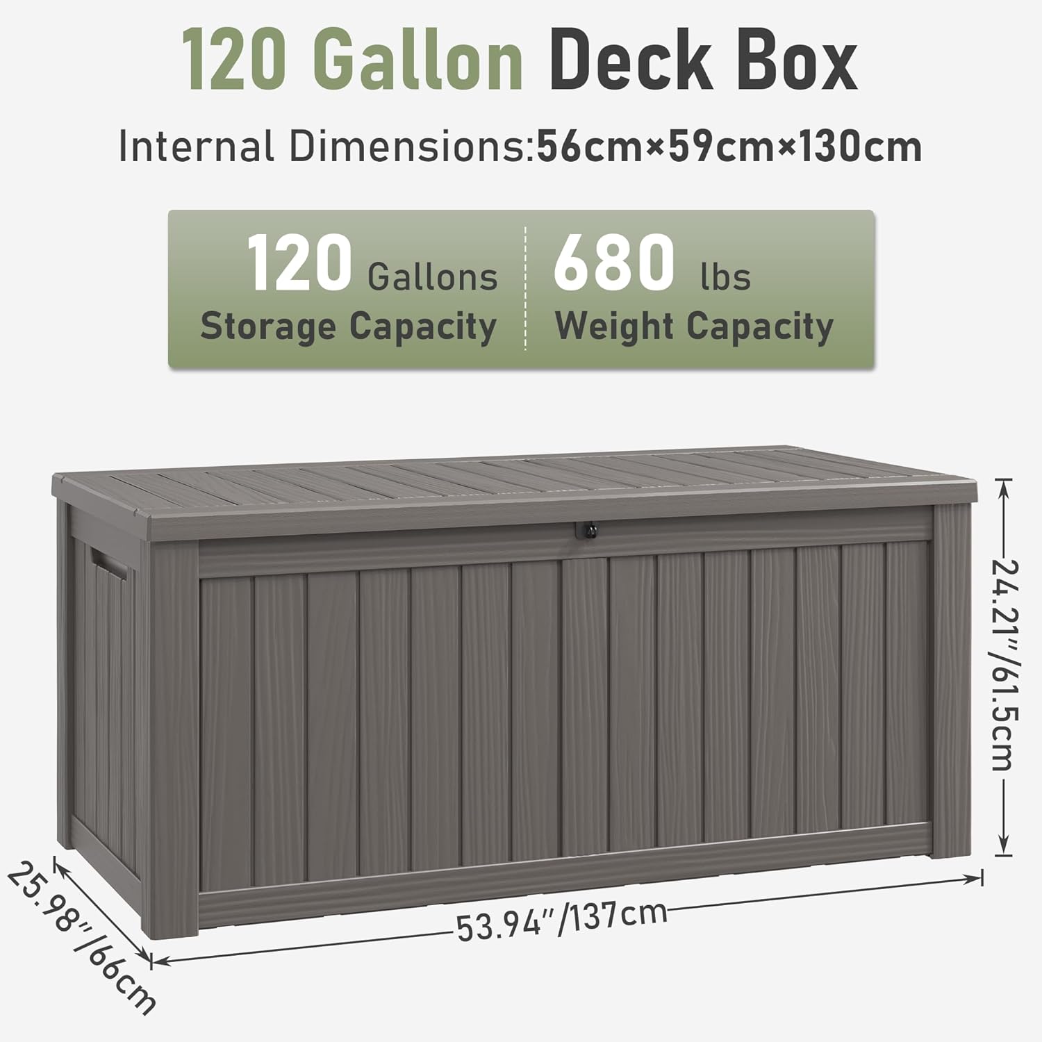 • Immense Storage Capacity: With dimensions of 53.9in x 25.98in x 24.21in, this deck box offers perfect storage space for all your outdoor essentials. It can hold up to 120 gallons of garden tools, pool supplies, patio furniture, cushions, and more.