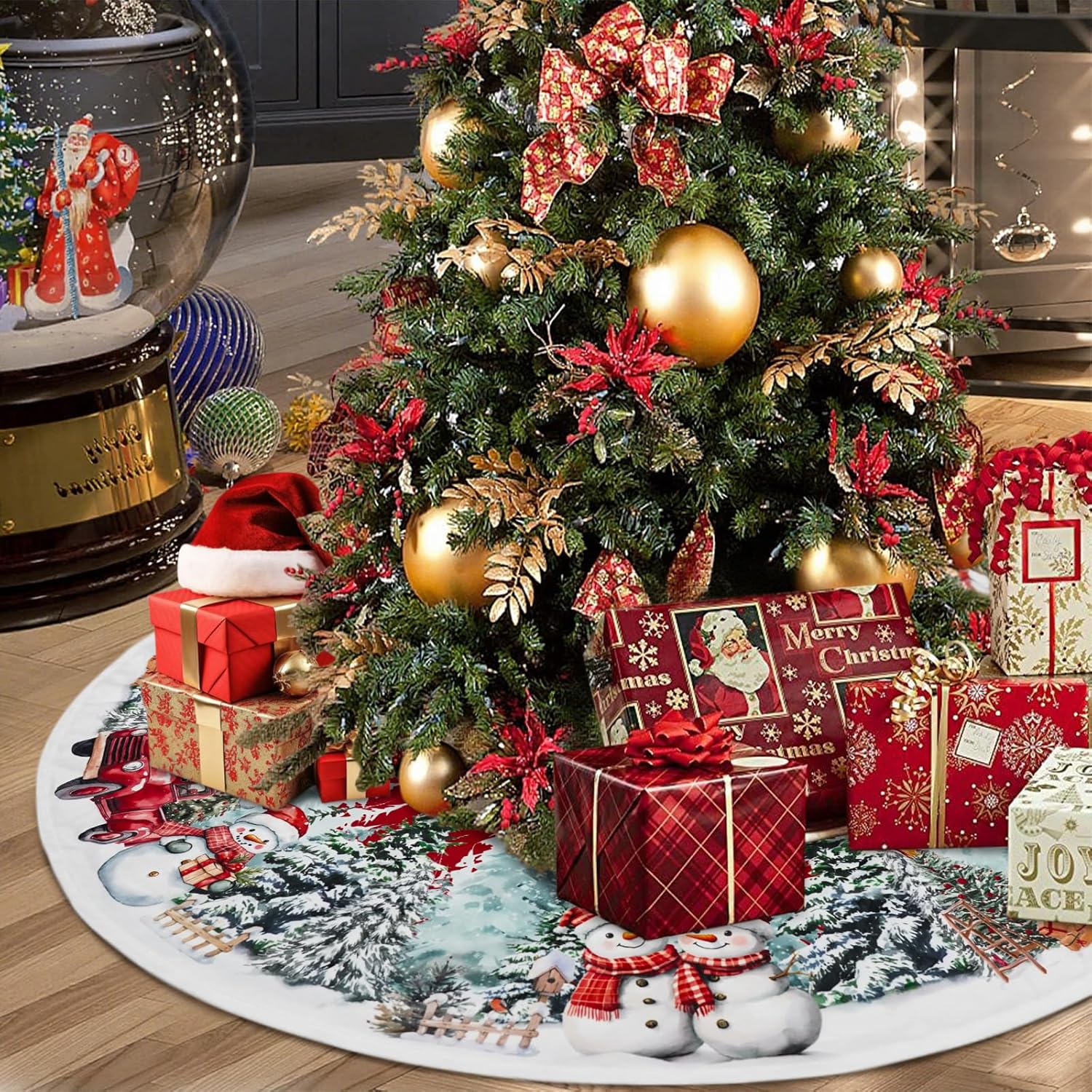 Christmas Tree Skirt 48 Inch, Red Snowman Trucker Xmas Tree Skirts, Winter Christmas Trees Mat for Home Party Holiday Indoor Outdoor Decorations