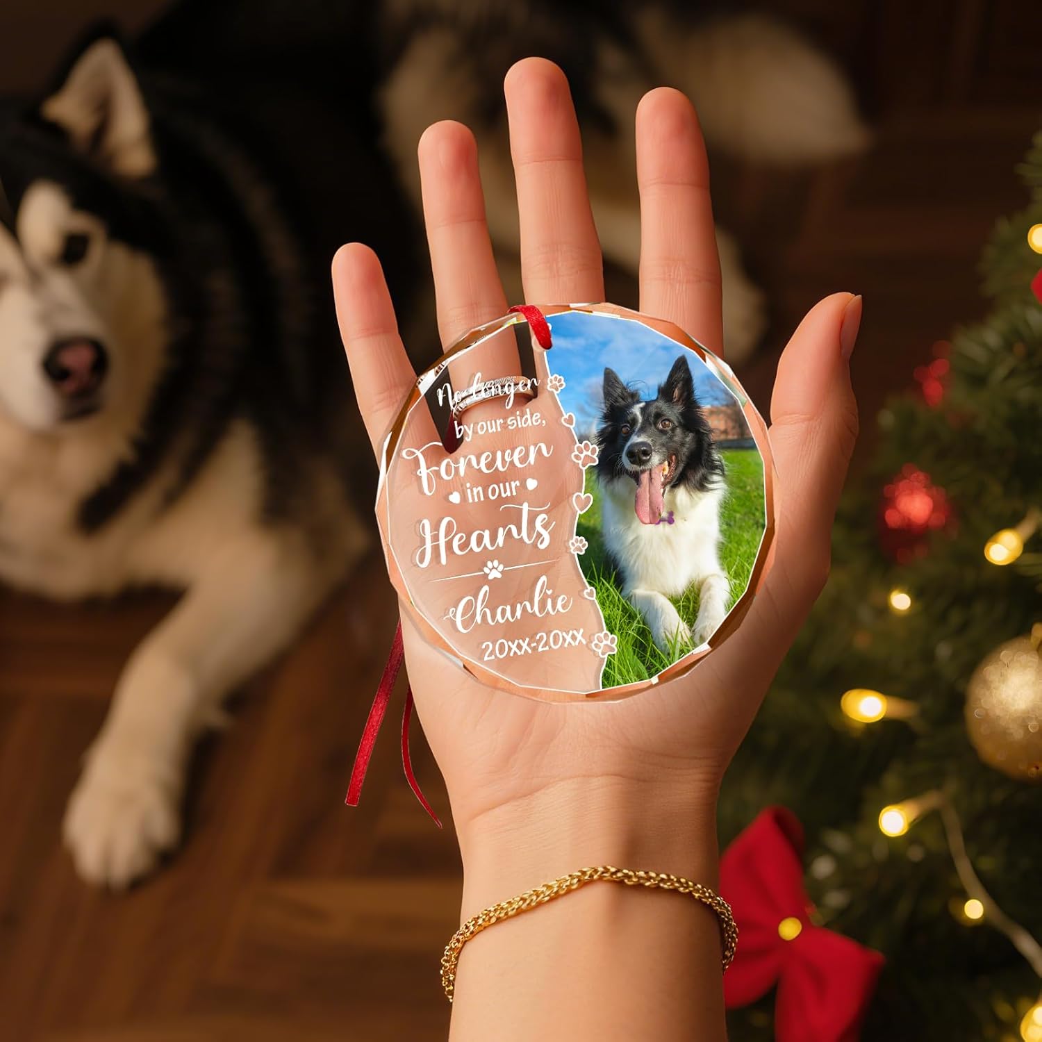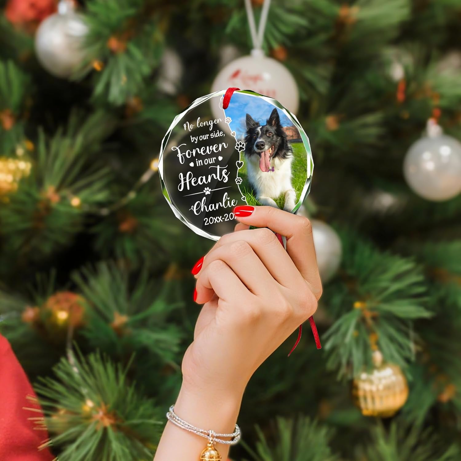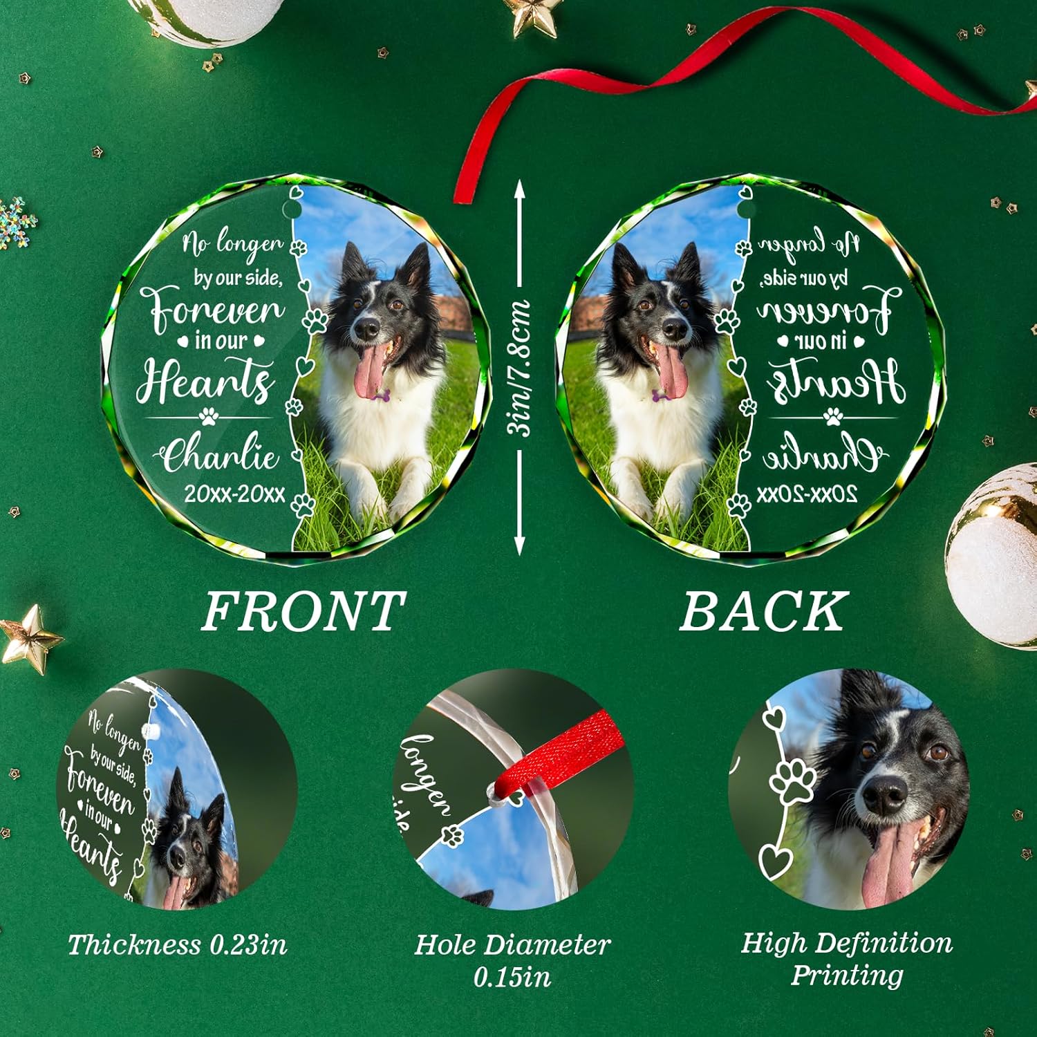 Personalized Memorial Pet Glass Ornament - Custom Picture Christmas Ornaments, Dog Forever in Our Hearts Hanging Ornament Xmas Tree Decor for Dog Lovers