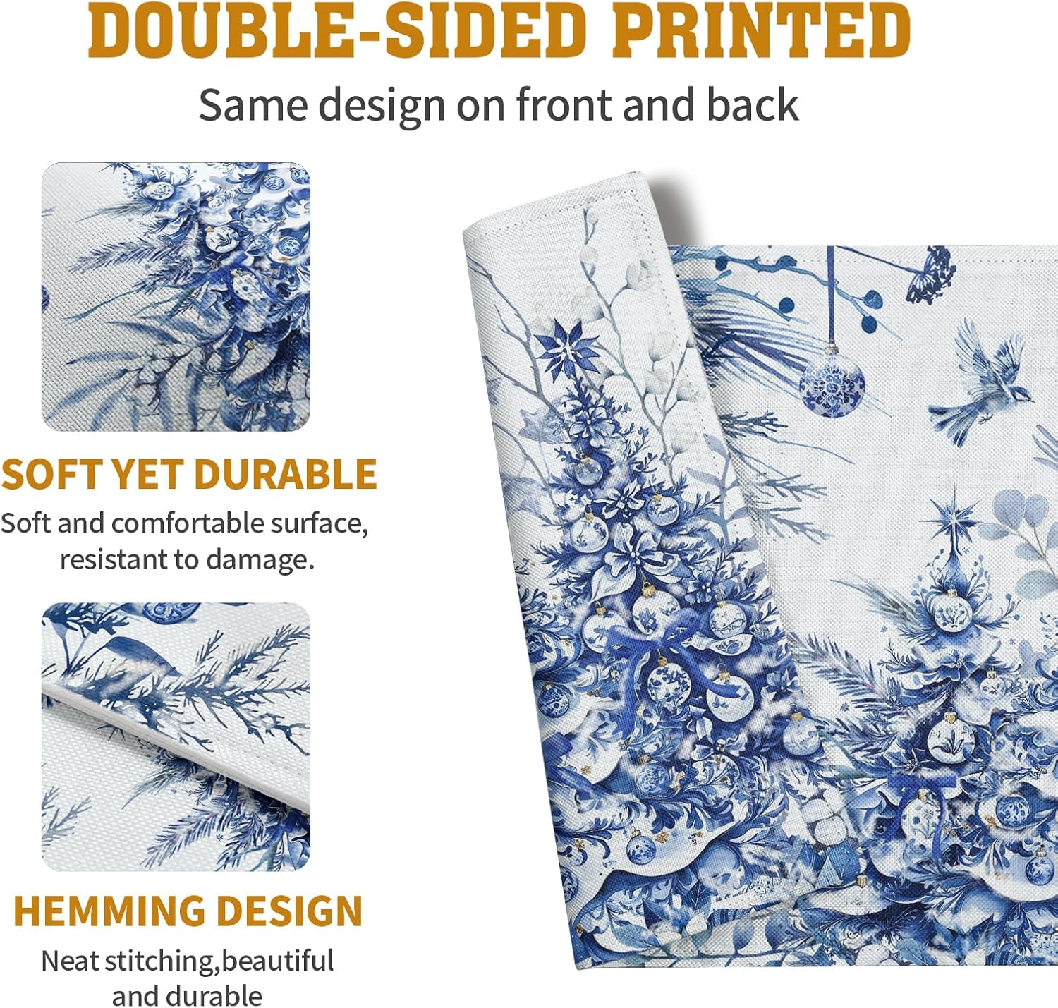 Blue and White Christmas Tree Placemats Set of 4, 12x18 Inch Chinoiserie Xmas Place Mats Winter Holiday Washable Linen Table Mats for Party Kitchen Dining Outdoor Indoor Decor