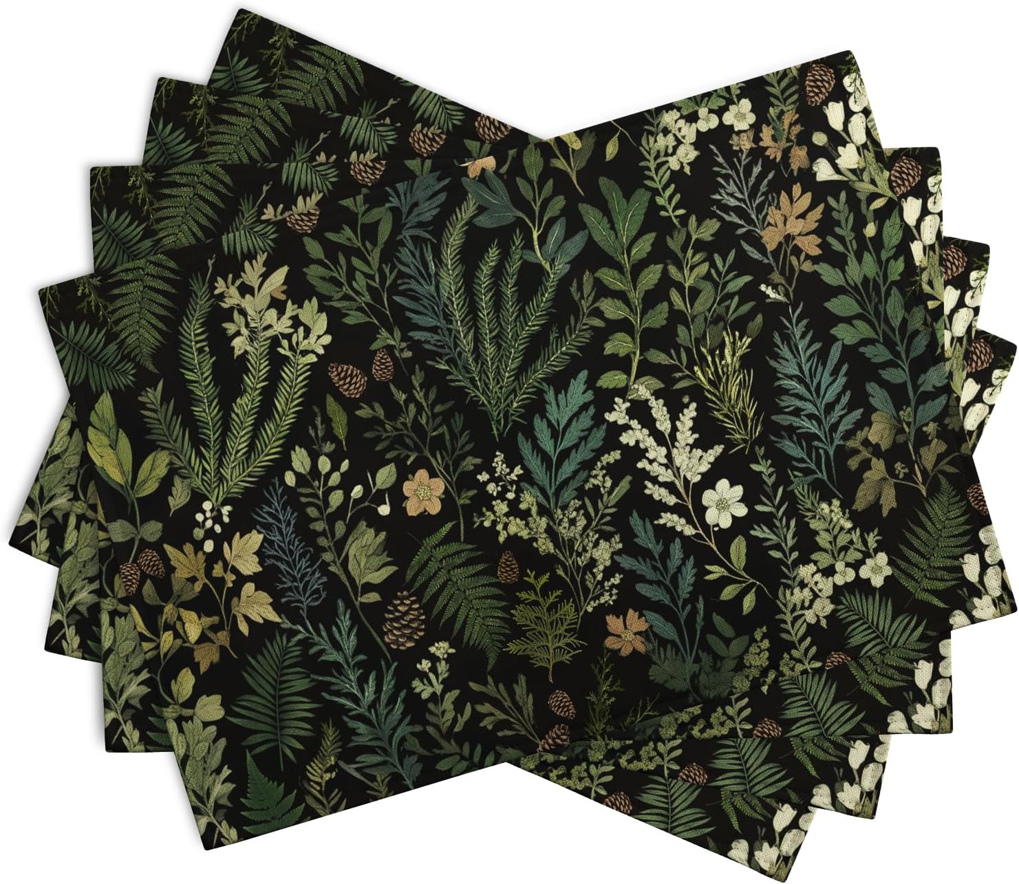 Black Sage Green Plant Placemats Set of 4 Vintage Botanic Fern Leaves Herb Floral Place Mats Rustic Farmhouse Linen Fabric Table Mats for Party Kitchen Dining Outdoor Indoor Decor