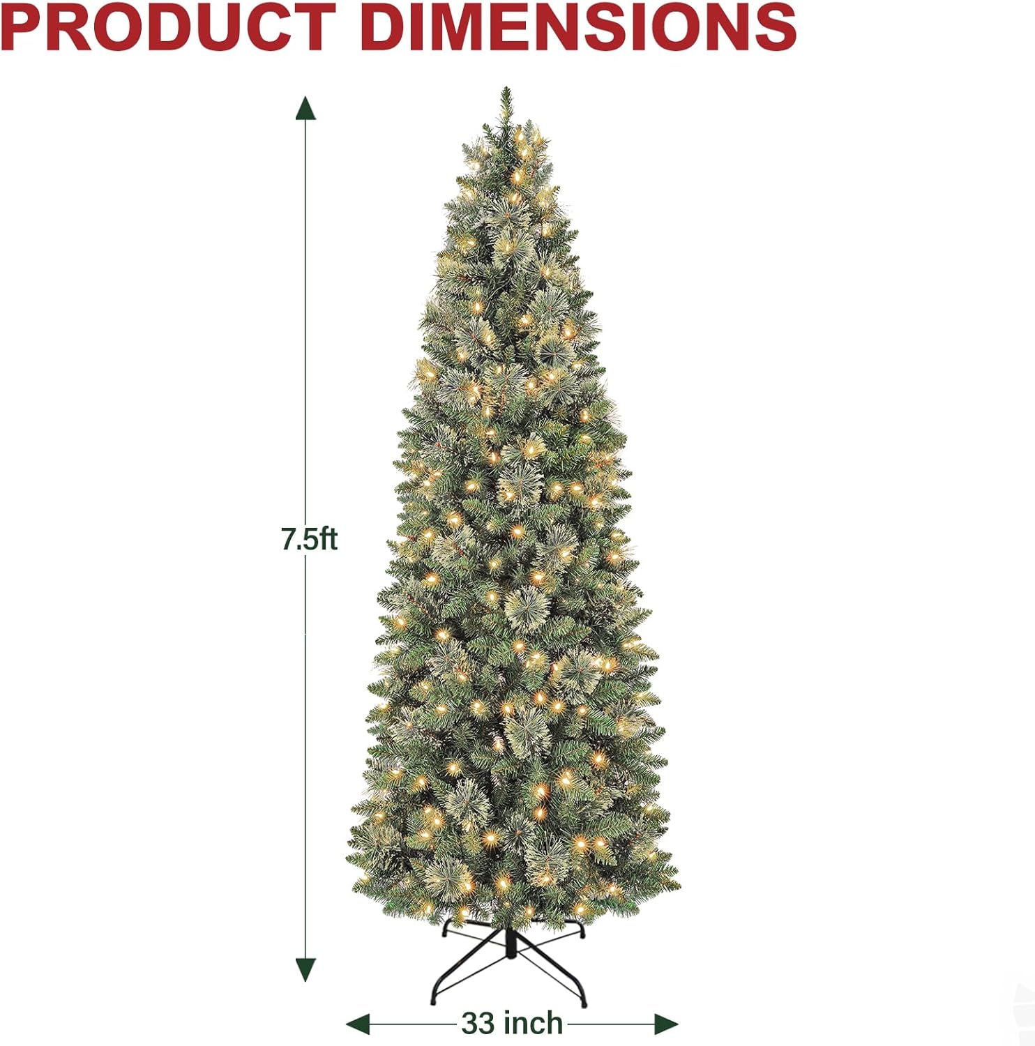 Hykolity 7.5ft Artificial Pre-lit Pencil Christmas Tree, Slim Christmas Tree with 300 Warm White LED Lights, 792 PVC Tips, Foldable Metal Stand and Hinged Branches