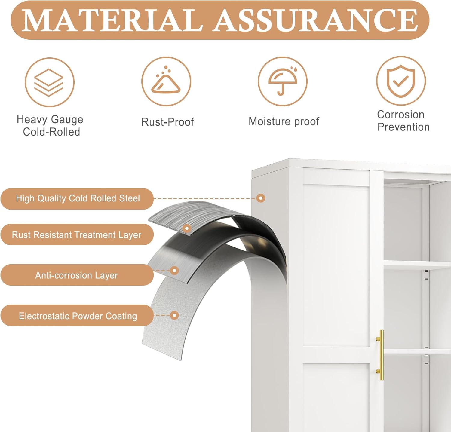 • 🌽【Sturdy Metal Structure】Our storage cabinets are generously sized to unlock the potential of your space.3 adjustable shelves can easily accommodate your storage needs. Our Metal Kitchen Pantry Storage Cabinets are made of durable cold-rolled steel material, with a safe and environmentally friendly powder coating on the surface, which is rust-proof, anti-corrosion, and odorless, ensuring safe food storage. Not only does the metal construction provide a large load capacity of up to 120 pounds, but it also makes it scratch resistant.