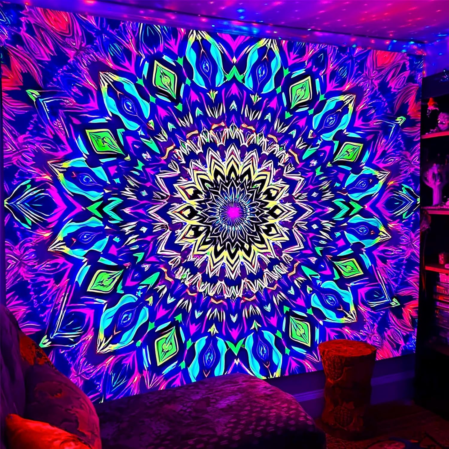 Blacklight Mandala Tapestry for Bedroom, Large Black Light Posters for Adults and Teens, Colorful UV Reactive Aesthetic Bohemian Wall Art Decor (80 x 60 Inches)