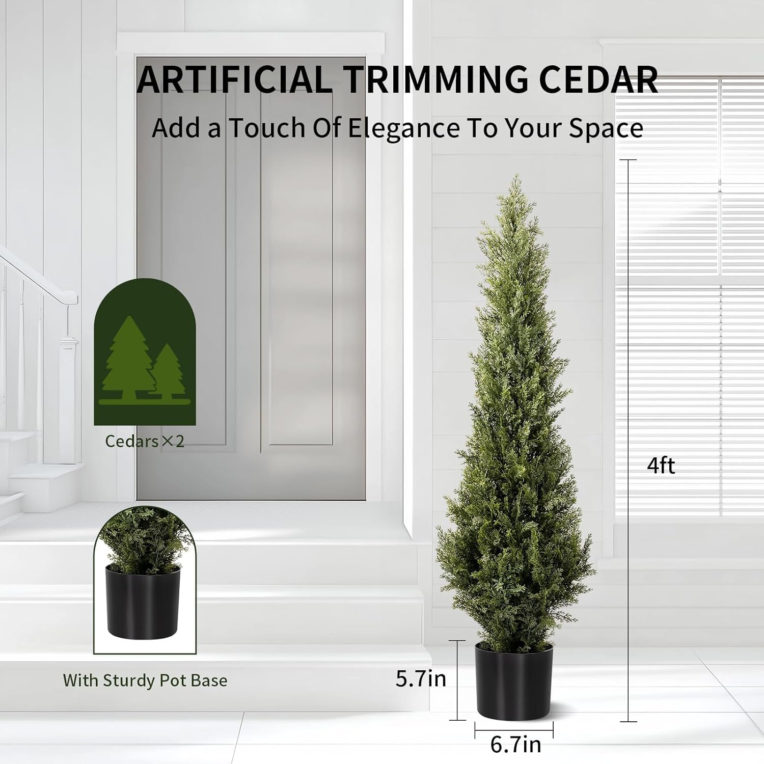 • 【Multi-Size Selection】These artificial topiary cedar trees have 3ft(36in)/4ft(48in)/5ft(60in)sizes, and each fake pine trees with quality black pots. Of course, to go better with the style of your house, you can put them in your other matching pots, and they will sit easily inside the bigger pots.