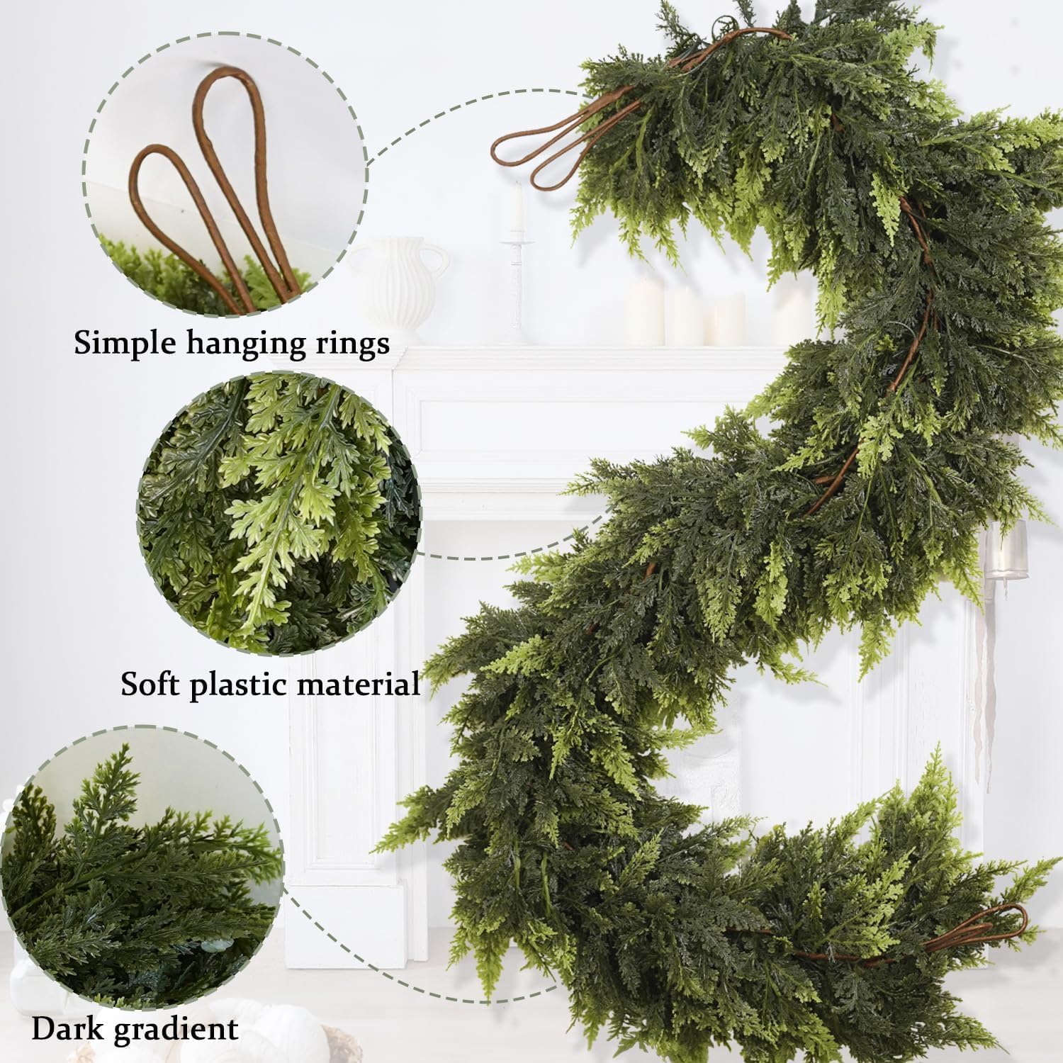 • 【Realistic Gradient Color Design】This 6 ft artificial cedar garlands features a lifelike gradient of green tones, transitioning smoothly from light to dark, mimicking the natural beauty of real cedar. The vibrant color variation creates a rich, multi-layered appearance, instantly enhancing your Christmas décor with a realistic touch