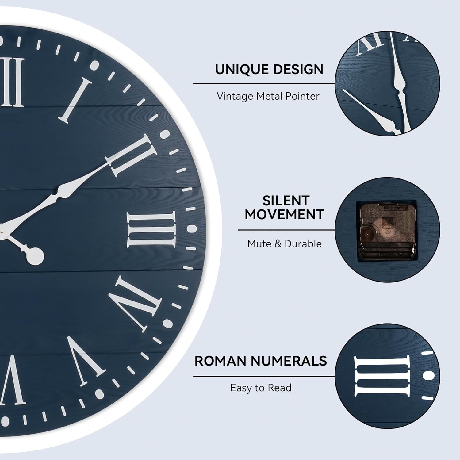 Large Wall Clock with Roman Numeral, 35” Shiplap Wall Clock Farmhouse Nearly Non-Ticking, Round Clock for Living Room Decor, Office, Bedroom, Entrance, Blue