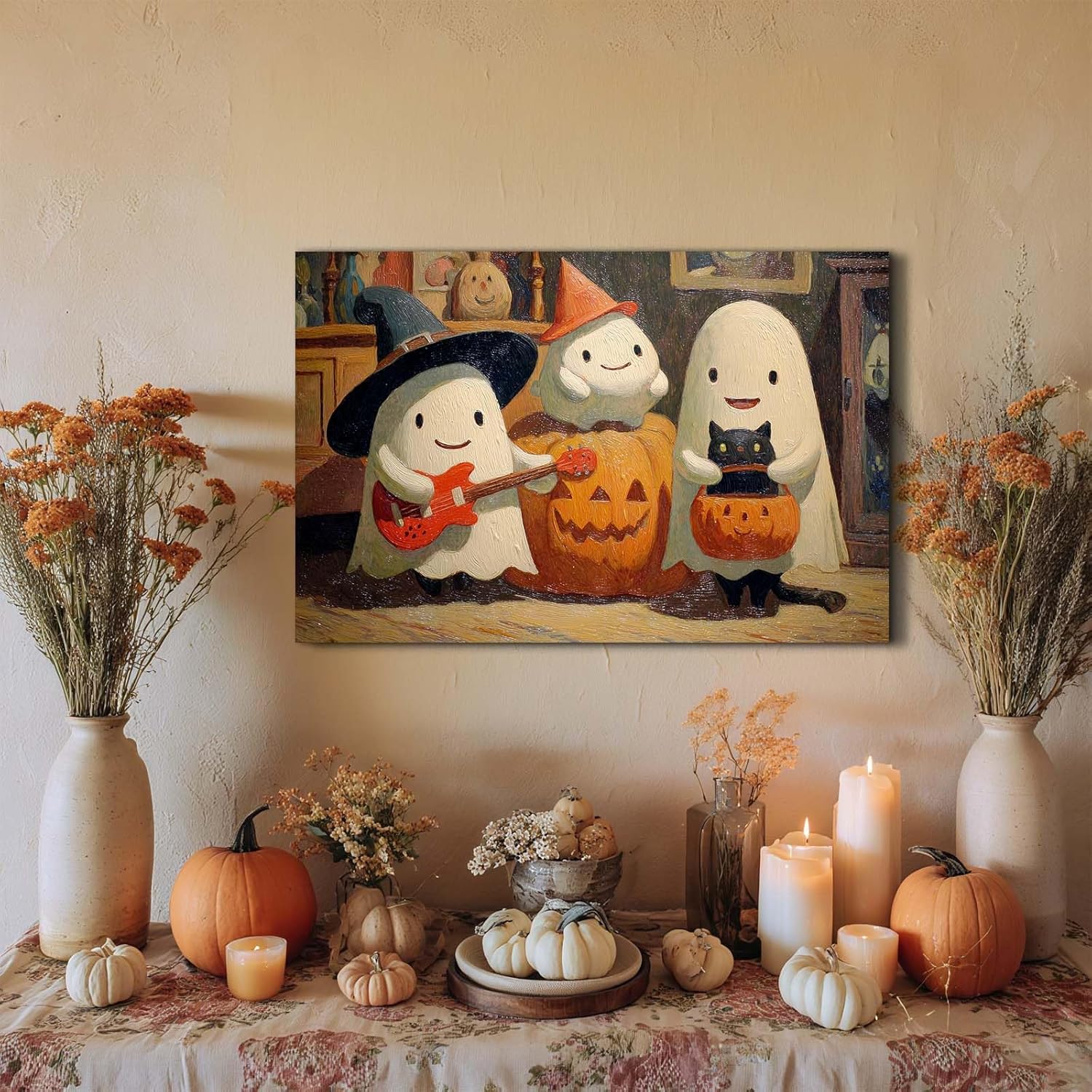 Laoife Vintage Halloween Canvas Wall Art, Autumn Pumpkin Cute Ghost Canvas Prints, Halloween Party House Decoration (Ghost 4)