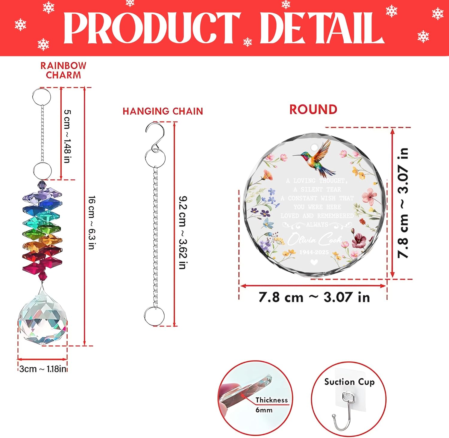 • Made from high-quality glass, this ornament features precise engraving and a smooth, polished finish. The attached rainbow suncatcher catches the light beautifully, adding a touch of sparkle and brightness to your holiday décor or any memorial display.